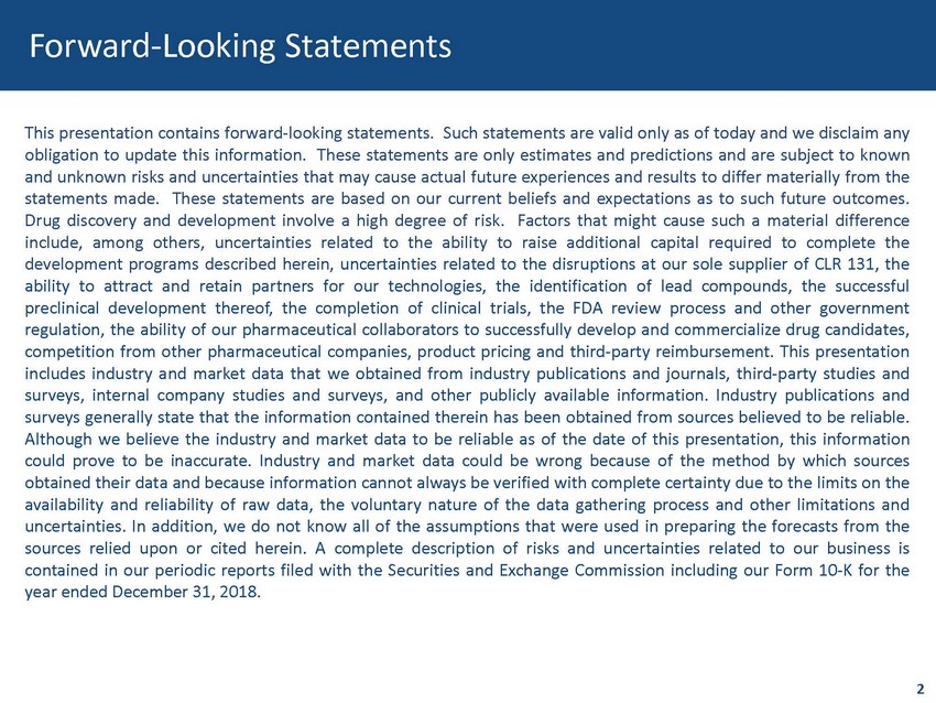 This presentation contains forward - looking statements . Such statements are valid only as of today and we disclaim any obligation to update this information . These statements are only estimates and predictions and are subject to known and unknown risks and uncertainties that may cause actual future experiences and results to differ materially from the statements made . These statements are based on our current beliefs and expectations as to such future outcomes . Drug discovery and development involve a high degree of risk . Factors that might cause such a material difference include, among others, uncertainties related to the ability to raise additional capital required to complete the development programs described herein, uncertainties related to the disruptions at our sole supplier of CLR 131 , the ability to attract and retain partners for our technologies, the identification of lead compounds, the successful preclinical development thereof, the completion of clinical trials, the FDA review process and other government regulation, the ability of our pharmaceutical collaborators to successfully develop and commercialize drug candidates, competition from other pharmaceutical companies, product pricing and third - party reimbursement . This presentation includes industry and market data that we obtained from industry publications and journals, third-party studies and surveys, internal company studies and surveys, and other publicly available information . Industry publications and surveys generally state that the information contained therein has been obtained from sources believed to be reliable . Although we believe the industry and market data to be reliable as of the date of this presentation, this information could prove to be inaccurate . Industry and market data could be wrong because of the method by which sources obtained their data and because information cannot always be verified with complete certainty due to the limits on the availability and reliability of raw data, the voluntary nature of the data gathering process and other limitations and uncertainties . In addition, we do not know all of the assumptions that were used in preparing the forecasts from the sources relied upon or cited herein . A complete description of risks and uncertainties related to our business is contained in our periodic reports filed with the Securities and Exchange Commission including our Form 10 - K for the year ended December 31 , 2018 . Forward - Looking Statements 2