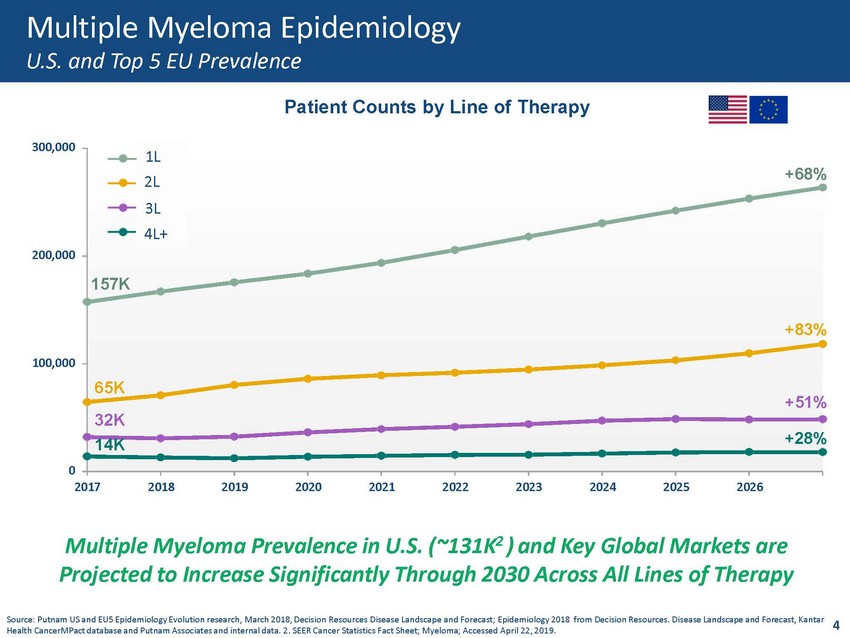 Multiple Myeloma Epidemiology U.S. and Top 5 EU Prevalence Multiple Myeloma Prevalence in U.S. (~131K 2 ) and Key Global Markets are Projected to Increase Significantly Through 2030 Across All Lines of Therapy 0 1 0 0 , 000 2 0 0 , 000 3 0 0 , 000 2 0 17 2 0 18 2 0 19 2 0 20 2 0 21 2 0 22 2 0 23 2 0 24 2 0 25 2 0 26 Patient Counts by Line of Therapy + 6 8% + 8 3% + 5 1% + 28% 157K 65K 32K 14K Source: Putnam US and EU5 Epidemiology Evolution research, March 2018, Decision Resources Disease Landscape and Forecast; Epidemiology 2018 from Decision Resources. Disease Landscape and Forecast, Kantar Health CancerMPact database and Putnam Associates and internal data. 2. SEER Cancer Statistics Fact Sheet; Myeloma; Accessed April 22, 2019. 1L 2L 3L 4L+ 4