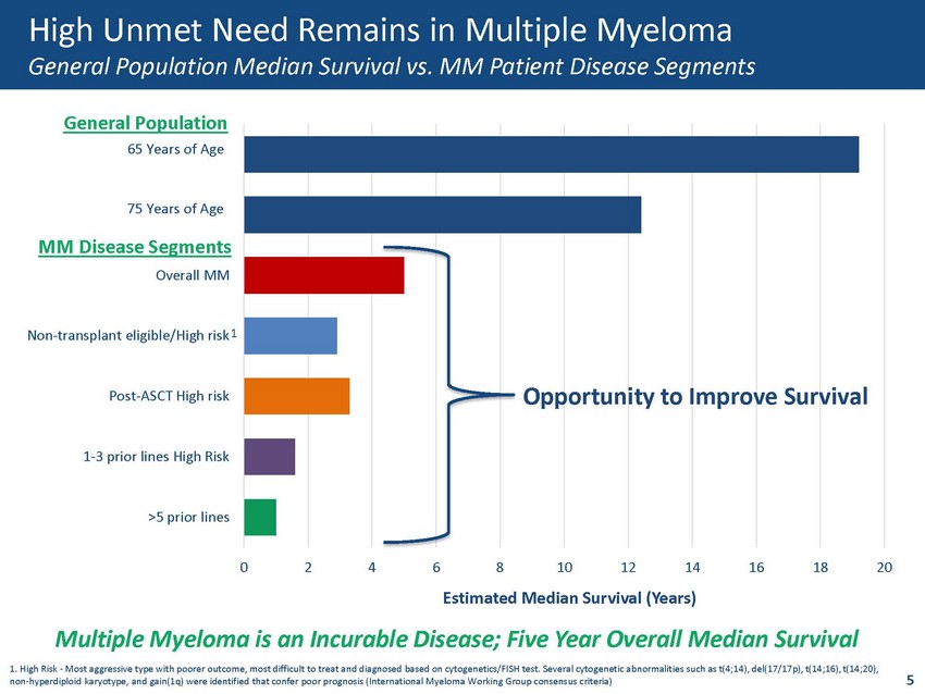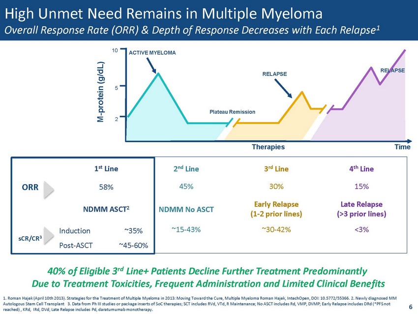 High Unmet Need Remains in Multiple Myeloma General Population Median Survival vs. MM Patient Disease Segments 0 2 4 6 8 10 12 14 16 18 20 >5 prior lines 1-3 prior lines High Risk Post-ASCT High risk Non-transplant eligible/High risk Overall MM 75 yo (general population) 65 yo (general population) Estimated Median Survival (Years) General Population 65 Years of Age 75 Years of Age Opportunity to Improve Survival Multiple Myeloma is an Incurable Disease; Five Year Overall Median Survival MM Disease Segments 5 1 1. High Risk - Most aggressive type with poorer outcome, most difficult to treat and diagnosed based on cytogenetics/FISH test. Several cytogenetic abnormalities such as t(4;14), del(17/17p), t(14;16), t(14;20), non - hyperdiploid karyotype, and gain(1q) were identified that confer poor prognosis (International Myeloma Working Group consens us criteria)