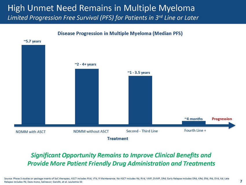 2 nd Line 3 rd Line 4 th Line 45% 30% 15% NDMM No ASCT Early Relapse (1 - 2 prior lines) Late Relapse (>3 prior lines) ~15 - 43% ~30 - 42% <3% 1 st Line ORR 58% NDMM ASCT 2 sCR/CR 3 Induction ~35% Post - ASCT ~45 - 60% High Unmet Need Remains in Multiple Myeloma Overall Response Rate (ORR) & Depth of Response Decreases with Each Relapse 1 Therap i es M - protein (g/dL) 2 5 10 R EL A P S E REL A PSE Ti me ACTIVE MYELOMA Plateau R emission 1. Roman Hajek (April 10th 2013). Strategies for the Treatment of Multiple Myeloma in 2013: Moving Toward the Cure, Multiple Myeloma Roman Hajek, IntechOpen, DOI: 10.5772/55366. 2. Newly diagnosed MM Autologous Stem Cell Transplant 3. Data from Ph III studies or package inserts of SoC therapies; SCT includes RVd, VTd, R Maintenance; No ASCT includes Rd, VMP, DVMP; Early Relapse includes DRd (*PFS not reached) , KRd, IRd, DVd; Late Relapse includes Pd, daratumumab monotherapy. 40% of Eligible 3 rd Line+ Patients Decline Further Treatment Predominantly Due to Treatment Toxicities, Frequent Administration and Limited Clinical Benefits 6