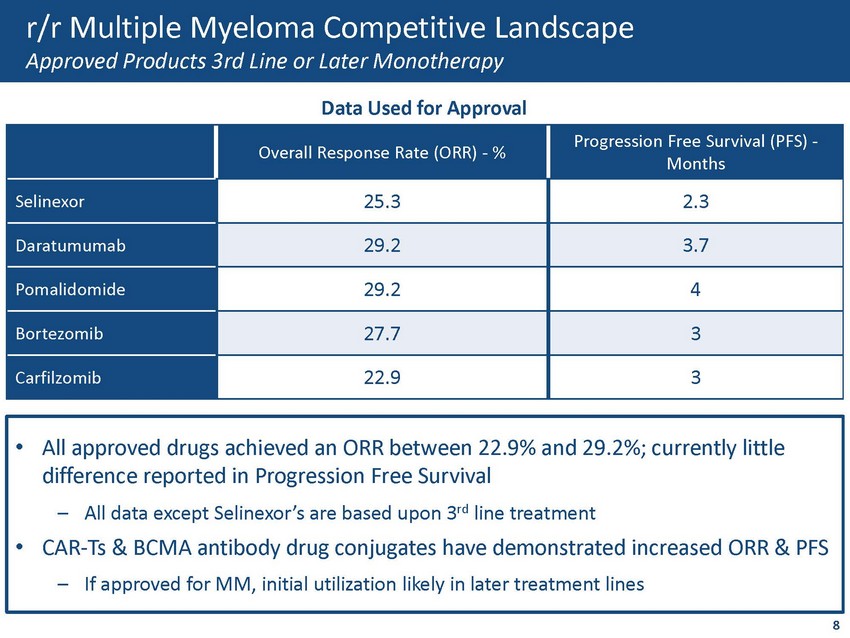 High Unmet Need Remains in Multiple Myeloma Limited Progression Free Survival (PFS) for Patients in 3 rd Line or Later Disease Progression in Multiple Myeloma (Median PFS) ~5.7 years ~2 - 4+ years ~1 - 3.5 years ~4 months NDMM with ASCT NDMM without ASCT Second - Third Line Fourth Line + Progression Treatment Source: Phase 3 studies or package inserts of SoC therapies; ASCT includes RVd, VTd, R Maintenance; No ASCT includes Rd, RVd, VM P, DVMP, DRd; Early Relapse includes DRd, KRd, ERd, IRd, DVd, Kd; Late Relapse includes Pd, Dara mono, Selinexor; Gandhi, et al. Leukemia 33 7 Significant Opportunity Remains to Improve Clinical Benefits and Provide More Patient Friendly Drug Administration and Treatments