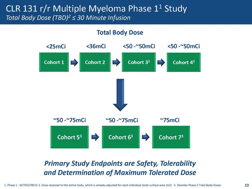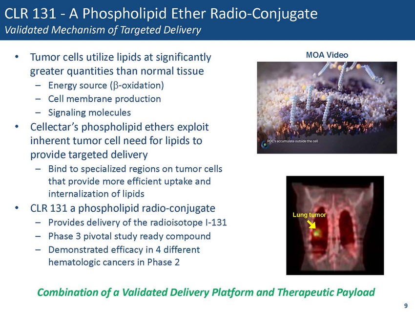 CLR 131 - A Phospholipid Ether Radio - Conjugate Validated Mechanism of Targeted Delivery • Tumor cells utilize lipids at significantly greater quantities than normal tissue – Energy source ( b - oxidation) – Cell membrane production – Signaling molecules • Cellectar’s phospholipid ethers exploit inherent tumor cell need for lipids to provide targeted delivery – Bind to specialized regions on tumor cells that provide more efficient uptake and internalization of lipids • CLR 131 a phospholipid radio - conjugate – Provides delivery of the radioisotope I - 131 – Phase 3 pivotal study ready compound – Demonstrated efficacy in 4 different hematologic cancers in Phase 2 9 Combination of a Validated Delivery Platform and Therapeutic Payload MOA Video Lung tumor