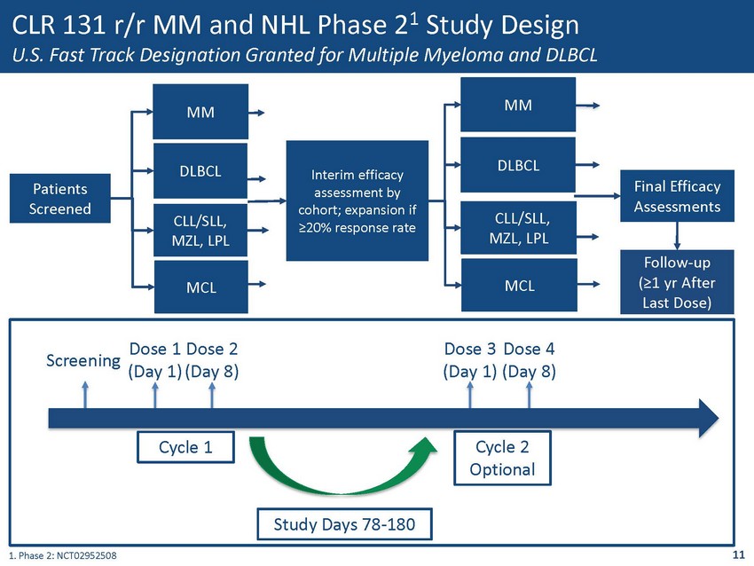 10 CLR 131 r/r Multiple Myeloma Phase 1 1 Study Total Body Dose (TBD) 2 ≤ 30 Minute Infusion 1. Phase 1 - NCT02278315 2. Dose received to the entire body, which is already adjusted for each individual body surface area (m2) 3. Denotes Phase 2 T otal Body Doses Primary Study Endpoints are Safety, Tolerability and Determination of Maximum Tolerated Dose Total Body Dose Cohort 1 Cohort 2 Cohort 3 3 Cohort 4 3 <25mCi <50 - ~50mCi <36mCi <50 - ~50mCi Cohort 5 3 Cohort 6 3 Cohort 7 3 ~50 - ~75mCi ~75mCi ~50 - ~75mCi