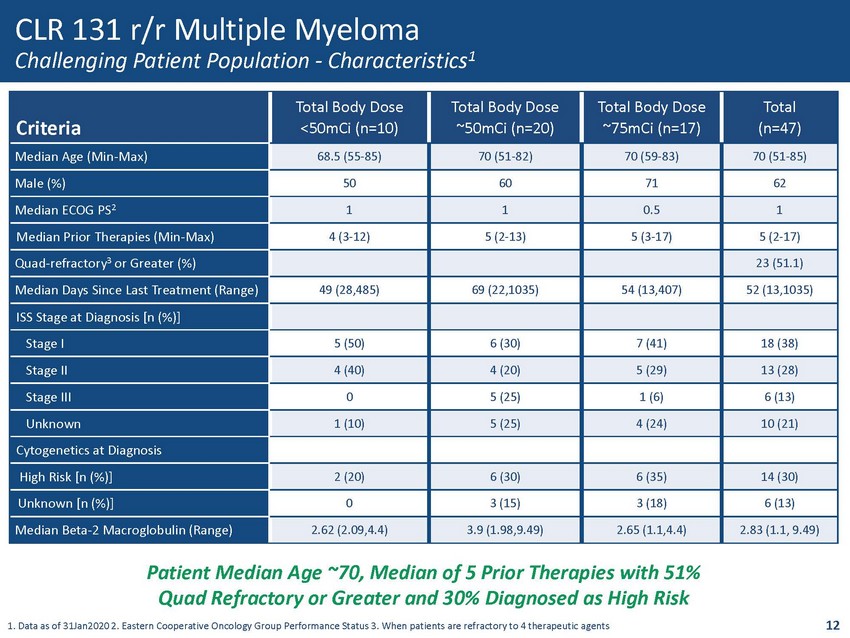 CLR 131 r/r MM and NHL Phase 2 1 Study Design U.S. Fast Track Designation Granted for Multiple Myeloma and DLBCL Screening Dose 1 (Day 1) Dose 2 (Day 8) Dose 3 (Day 1) Dose 4 (Day 8) Cycle 1 Cycle 2 Optional Study Days 78 - 180 11 1. Phase 2: NCT02952508 Patients Screened CLL/SLL, MZL, LPL DLBCL MM Follow - up (≥1 yr After Last Dose) Final Efficacy Assessments Interim efficacy assessment by cohort; expansion if ≥20% response rate MM DLBCL CLL/SLL, MZL, LPL MCL MCL