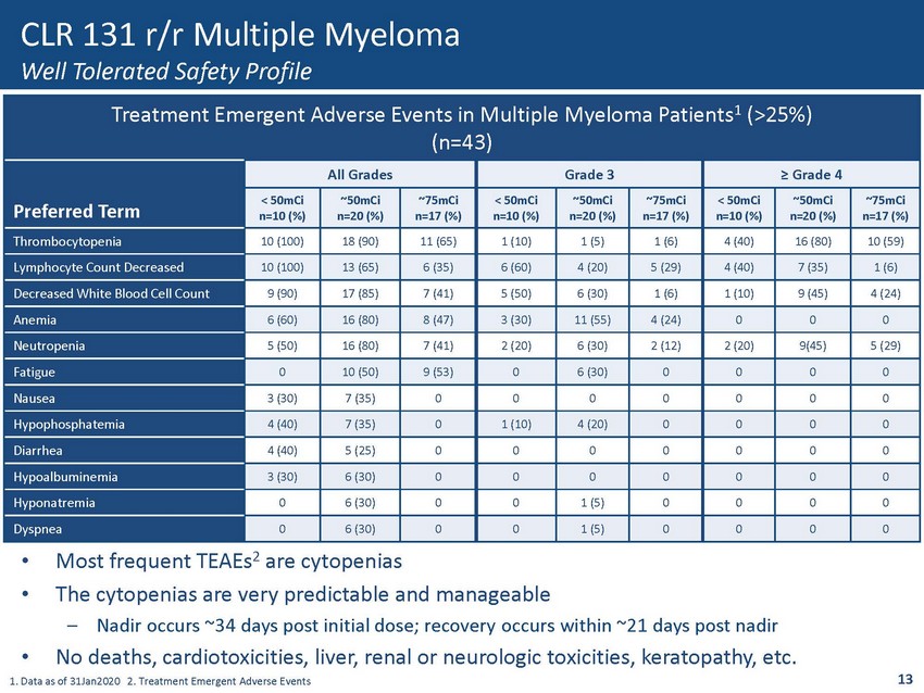 Criteria Total Body Dose <50mCi ( n=10) Total Body Dose ~50mCi ( n=20) Total Body Dose ~75mCi (n=17) Total (n=47) Median Age (Min - Max) 68.5 (55 - 85) 70 (51 - 82) 70 (59 - 83) 70 (51 - 85) Male (%) 50 60 71 62 Median ECOG PS 2 1 1 0.5 1 Median Prior Therapies (Min - Max) 4 (3 - 12) 5 (2 - 13) 5 (3 - 17) 5 (2 - 17) Quad - refractory 3 or Greater (%) 23 (51.1) Median Days Since Last Treatment (Range) 49 (28,485) 69 (22,1035) 54 (13,407) 52 (13,1035) ISS Stage at Diagnosis [n (%)] Stage I 5 (50) 6 (30) 7 (41) 18 (38) Stage II 4 (40) 4 (20) 5 (29) 13 (28) Stage III 0 5 (25) 1 (6) 6 (13) Unknown 1 (10) 5 (25) 4 (24) 10 (21) Cytogenetics at Diagnosis High Risk [n (%)] 2 (20) 6 (30) 6 (35) 14 (30) Unknown [n (%)] 0 3 (15) 3 (18) 6 (13) Median Beta - 2 Macroglobulin (Range) 2.62 (2.09,4.4) 3.9 (1.98,9.49) 2.65 (1.1,4.4) 2.83 (1.1, 9.49) Patient Median Age ~70, Median of 5 Prior Therapies with 51% Quad Refractory or Greater and 30% Diagnosed as High Risk 12 CLR 131 r/r Multiple Myeloma Challenging Patient Population - Characteristics 1 1. Data as of 31Jan2020 2. Eastern Cooperative Oncology Group Performance Status 3. When patients are refractory to 4 therape uti c agents