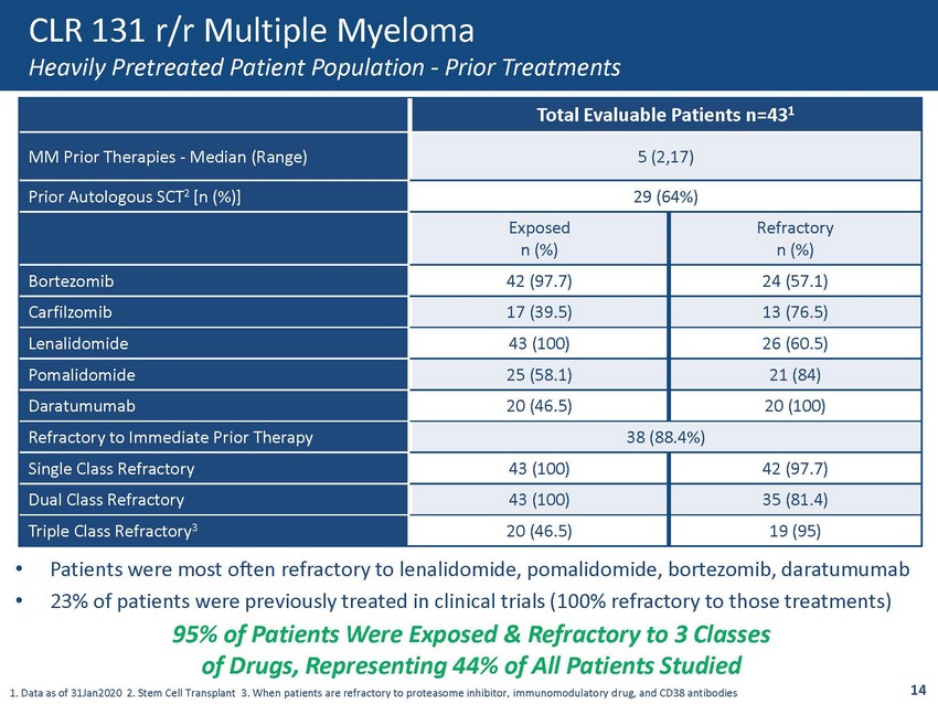 CLR 131 r/r Multiple Myeloma Well Tolerated Safety Profile 1. Data as of 31Jan2020 2. Treatment Emergent Adverse Events 13 • Most frequent TEAEs 2 are cytopenias • The cytopenias are very predictable and manageable – Nadir occurs ~34 days post initial dose; recovery occurs within ~21 days post nadir • No deaths, cardiotoxicities, liver, renal or neurologic toxicities, keratopathy, etc. Treatment Emergent Adverse Events in Multiple Myeloma Patients 1 (>25%) (n=43) Preferred Term All Grades Grade 3 ≥ Grade 4 < 50mCi n=10 (%) ~50mCi n=20 (%) ~75mCi n=17 (%) < 50mCi n=10 (%) ~50mCi n=20 (%) ~75mCi n=17 (%) < 50mCi n=10 (%) ~50mCi n=20 (%) ~75mCi n=17 (%) Thrombocytopenia 10 (100) 18 (90) 11 (65) 1 (10) 1 (5) 1 (6) 4 (40) 16 (80) 10 (59) Lymphocyte Count Decreased 10 (100) 13 (65) 6 (35) 6 (60) 4 (20) 5 (29) 4 (40) 7 (35) 1 (6) Decreased White Blood Cell Count 9 (90) 17 (85) 7 (41) 5 (50) 6 (30) 1 (6) 1 (10) 9 (45) 4 (24) Anemia 6 (60) 16 (80) 8 (47) 3 (30) 11 (55) 4 (24) 0 0 0 Neutropenia 5 (50) 16 (80) 7 (41) 2 (20) 6 (30) 2 (12) 2 (20) 9(45) 5 (29) Fatigue 0 10 (50) 9 (53) 0 6 (30) 0 0 0 0 Nausea 3 (30) 7 (35) 0 0 0 0 0 0 0 Hypophosphatemia 4 (40) 7 (35) 0 1 (10) 4 (20) 0 0 0 0 Diarrhea 4 (40) 5 (25) 0 0 0 0 0 0 0 Hypoalbuminemia 3 (30) 6 (30) 0 0 0 0 0 0 0 Hyponatremia 0 6 (30) 0 0 1 (5) 0 0 0 0 Dyspnea 0 6 (30) 0 0 1 (5) 0 0 0 0