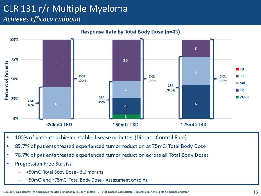 CLR 131 r/r Multiple Myeloma Heavily Pretreated Patient Population - Prior Treatments Total Evaluable Patients n=43 1 MM Prior Therapies - Median (Range) 5 (2,17) Prior Autologous SCT 2 [n (%)] 29 (64%) Exposed n (%) Refractory n (%) Bortezomib 42 (97.7) 24 (57.1) Carfilzomib 17 (39.5) 13 (76.5) Lenalidomide 43 (100) 26 (60.5) Pomalidomide 25 (58.1) 21 (84) Daratumumab 20 (46.5) 20 (100) Refractory to Immediate Prior Therapy 38 (88.4%) Single Class Refractory 43 (100) 42 (97.7) Dual Class Refractory 43 (100) 35 (81.4) Triple Class Refractory 3 20 (46.5) 19 (95) 1. Data as of 31Jan2020 2. Stem Cell Transplant 3. When patients are refractory to proteasome inhibitor, immunomodulatory d rug , and CD38 antibodies 14 • Patients were most often refractory to lenalidomide, pomalidomide, bortezomib, daratumumab • 23% of patients were previously treated in clinical trials (100% refractory to those treatments) 95% of Patients Were Exposed & Refractory to 3 Classes of Drugs, Representing 44% of All Patients Studied