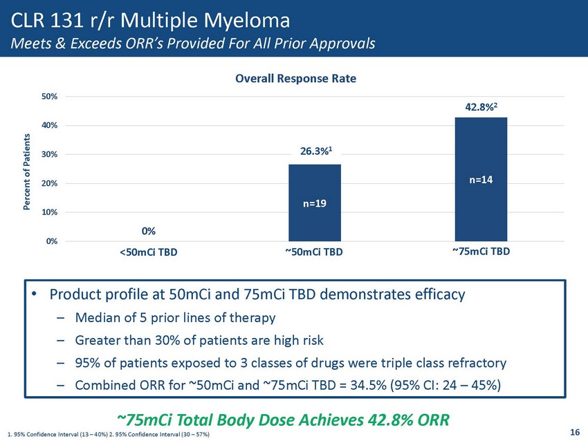 0% 25% 50% 75% 100% Response Rate by Total Body Dose (n=43) PD SD MR PR VGPR CBR 78.6% DCR 100% DCR 100% CBR 45% CBR 40% 10 4 4 1 6 4 DCR 100% CLR 131 r/r Multiple Myeloma Achieves Efficacy Endpoint • 100% of patients achieved stable disease or better (Disease Control Rate) • 85.7% of patients treated experienced tumor reduction at 75mCi Total Body Dose • 76.7% of patients treated experienced tumor reduction across all Total Body Doses • Progression Free Survival – <50mCi Total Body Dose - 3.6 months – ~50mCi and ~75mCi Total Body Dose - Assessment ongoing 1. (CBR) Clinical Benefit Rate measures reduction in tumor by FLC or M protein 2. (DCR) Disease Control Rate - Patients exper iencing stable disease or better 15 <50mCi TBD ~50mCi TBD ~75mCi TBD Percent of Patients 3 5 6