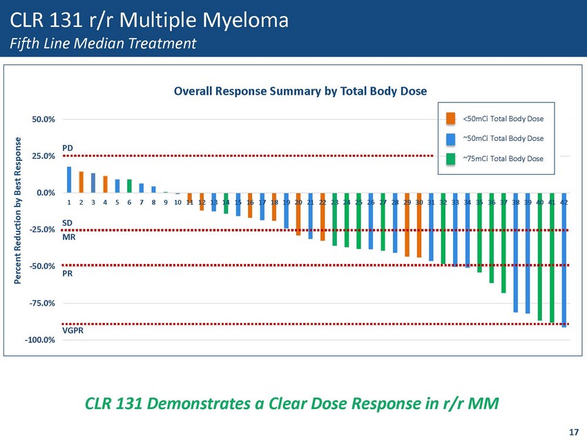 CLR 131 r/r Multiple Myeloma Meets & Exceeds ORR’s Provided For All Prior Approvals • Product profile at 50mCi and 75mCi TBD demonstrates efficacy – Median of 5 prior lines of therapy – Greater than 30% of patients are high risk – 95% of patients exposed to 3 classes of drugs were triple class refractory – Combined ORR for ~50mCi and ~75mCi TBD = 34.5% (95% CI: 24 – 45%) n = 19 n = 13 ~75mCi Total Body Dose Achieves 42.8% ORR 16 Percent of Patients <50mCi TBD ~50mCi TBD ~75mCi TBD 0% n=19 n=14 0% 10% 20% 30% 40% 50% Overall Response Rate 42.8% 2 26.3% 1 1. 95% Confidence Interval (13 – 40%) 2. 95% Confidence Interval (30 – 57%)