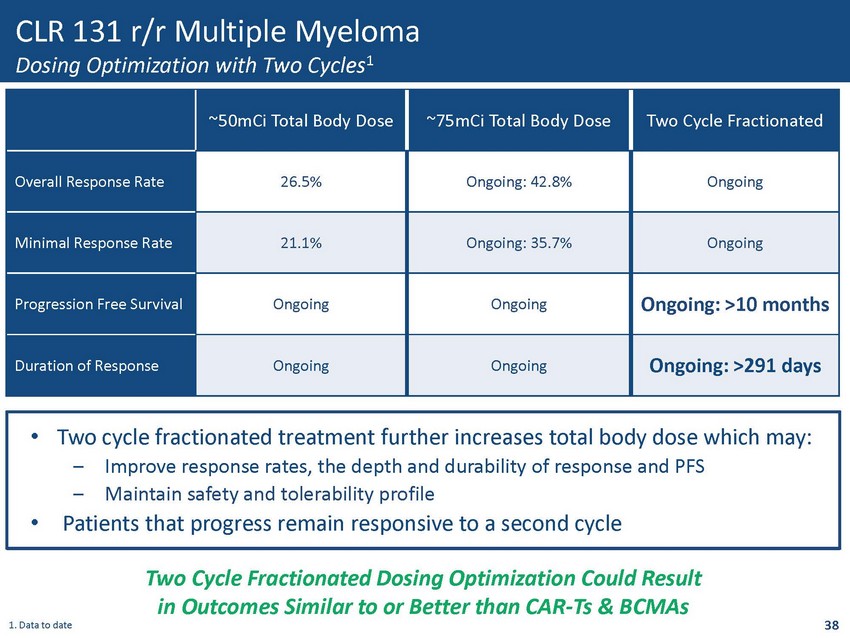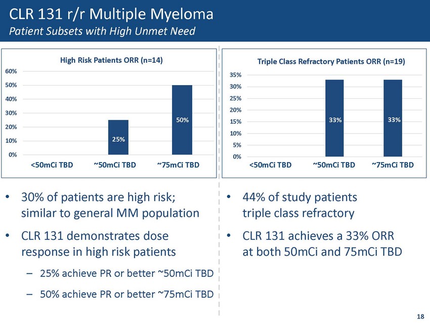 -100.0% -75.0% -50.0% -25.0% 0.0% 25.0% 50.0% 1 2 3 4 5 6 7 8 9 10 11 12 13 14 15 16 17 18 19 20 21 22 23 24 25 26 27 28 29 30 31 32 33 34 35 36 37 38 39 40 41 42 Overall Response Summary by Total Body Dose <50mCi Total Body Dose ~50mCi Total Body Dose ~75mCi Total Body Dose VGPR PR MR PD SD CLR 131 r/r Multiple Myeloma Fifth Line Median Treatment CLR 131 Demonstrates a Clear Dose Response in r/r MM 17 Percent Reduction by Best Response