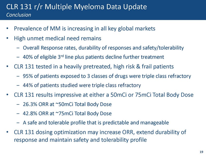 0% 10% 20% 30% 40% 50% 60% <50 mCiTBD ~50 mCi TBD ~75 mCi TBD High Risk Patients ORR (n=14) 0% 5% 10% 15% 20% 25% 30% 35% <50 mCiTBD ~50 mCi TBD ~75 mCi TBD Triple Class Refractory Patients ORR (n=19) CLR 131 r/r Multiple Myeloma Patient Subsets with High Unmet Need • 30% of patients are high risk; similar to general MM population • CLR 131 demonstrates dose response in high risk patients – 25% achieve PR or better ~50mCi TBD – 50% achieve PR or better ~75mCi TBD • 44% of study patients triple class refractory • CLR 131 achieves a 33% ORR at both 50mCi and 75mCi TBD 18 <50mCi TBD ~50mCi TBD ~75mCi TBD <50mCi TBD ~50mCi TBD ~75mCi TBD 25% 50% 33% 33%