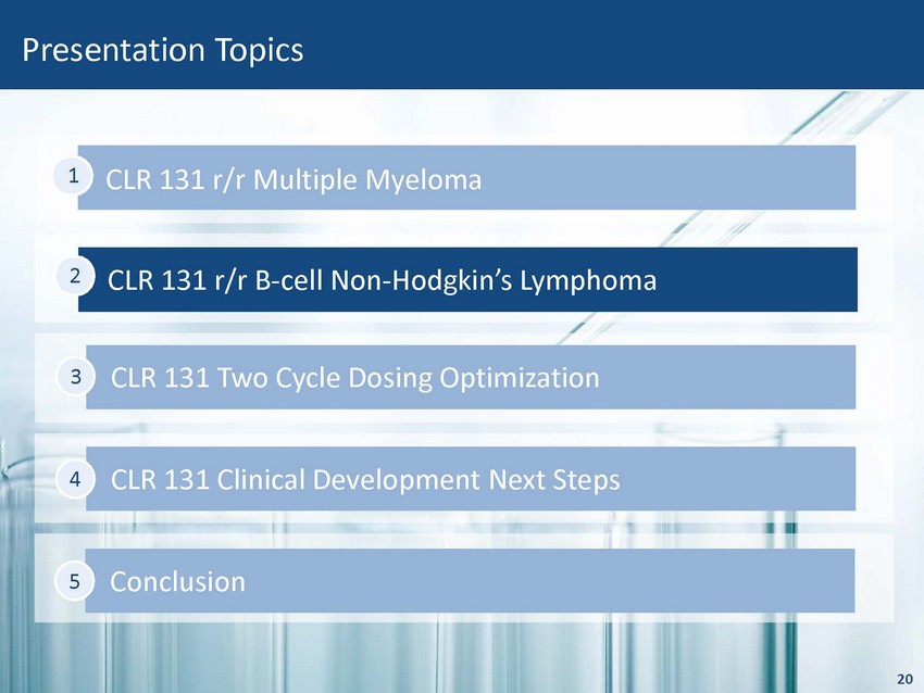 20 CLR 131 r/r Multiple Myeloma 1 Presentation Topics CLR 131 r/r B - cell Non - Hodgkin’s Lymphoma 2 CLR 131 Two Cycle Dosing Optimization 3 CLR 131 Clinical Development Next Steps 4 Conclusion 5