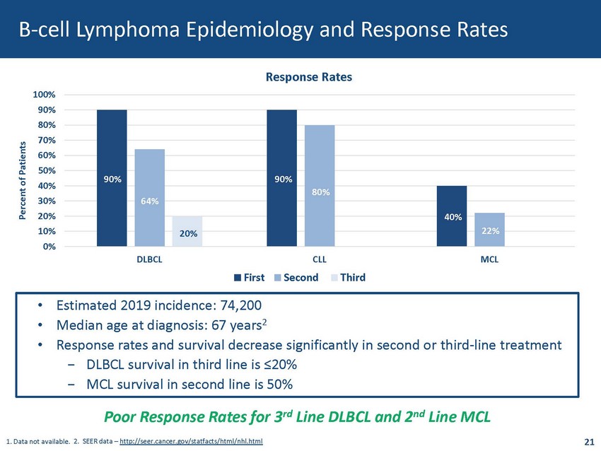 • Estimated 2019 incidence: 74,200 • Median age at diagnosis: 67 years 2 • Response rates and survival decrease significantly in second or third - line treatment − DLBCL survival in third line is ≤20% − MCL survival in second line is 50% B - cell Lymphoma Epidemiology and Response Rates 0% 10% 20% 30% 40% 50% 60% 70% 80% 90% 100% DLBCL CLL MCL Response Rates First Second Third Poor Response Rates for 3 rd Line DLBCL and 2 nd Line MCL 21 1. Data not available. 2. SEER data – http://seer.cancer.gov/statfacts/html/nhl.html Percent of Patients 90% 64% 20% 22% 40% 80% 90%