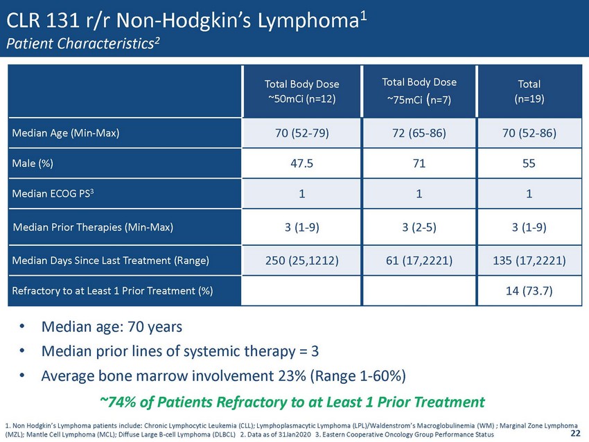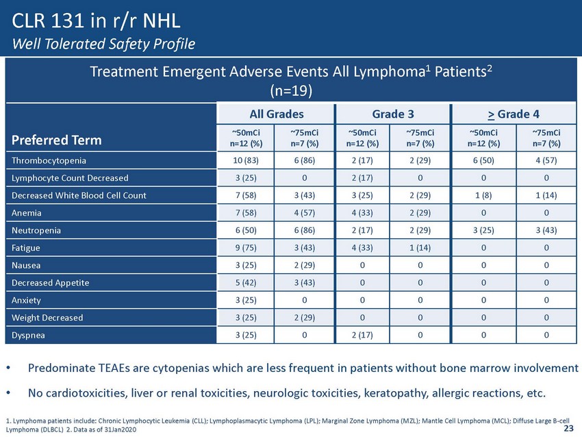 CLR 131 r/r Non - Hodgkin’s Lymphoma 1 Patient Characteristics 2 Total Body Dose ~50mCi ( n=12) Total Body Dose ~75mCi ( n=7) Total (n=19) Median Age (Min - Max) 70 (52 - 79) 72 (65 - 86) 70 (52 - 86) Male (%) 47.5 71 55 Median ECOG PS 3 1 1 1 Median Prior Therapies (Min - Max) 3 (1 - 9) 3 (2 - 5) 3 (1 - 9) Median Days Since Last Treatment (Range) 250 (25,1212) 61 (17,2221) 135 (17,2221) Refractory to at Least 1 Prior Treatment (%) 14 (73.7) 1. Non Hodgkin’s Lymphoma patients include: Chronic Lymphocytic Leukemia (CLL); Lymphoplasmacytic Lymphoma (LPL)/Waldenstrom’ s M acroglobulinemia (WM) ; Marginal Zone Lymphoma (MZL); Mantle Cell Lymphoma (MCL); Diffuse Large B - cell Lymphoma (DLBCL) 2. Data as of 31Jan2020 3 . Eastern Cooperative Oncology Group Performance Status • Median age: 70 years • Median prior lines of systemic therapy = 3 • Average bone marrow involvement 23% (Range 1 - 60%) ~74% of Patients Refractory to at Least 1 Prior Treatment 22