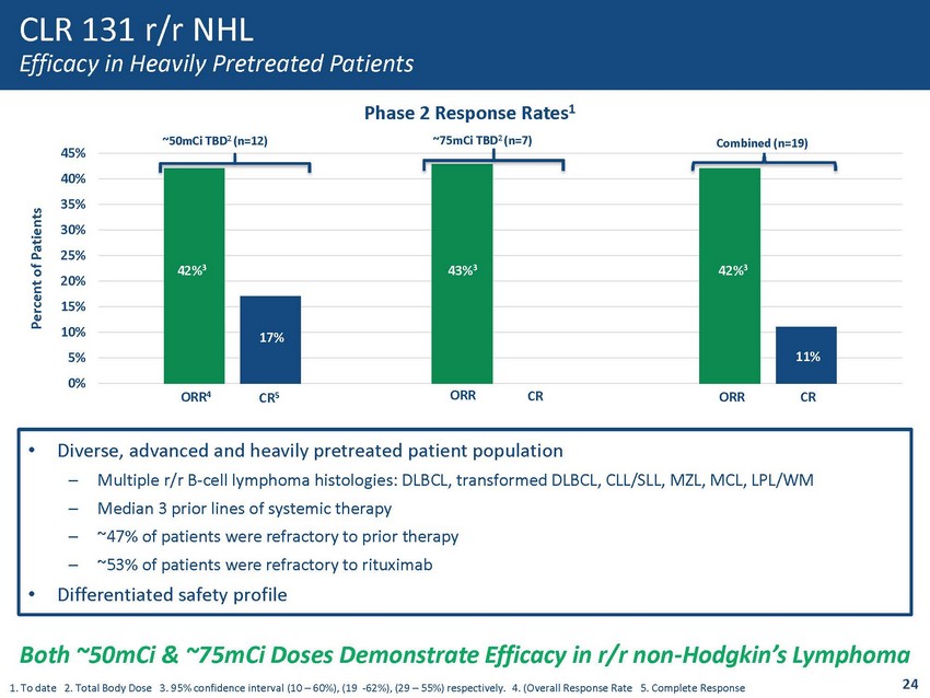 CLR 131 in r/r NHL Well Tolerated Safety Profile 1. Lymphoma patients include: Chronic Lymphocytic Leukemia (CLL); Lymphoplasmacytic Lymphoma (LPL); Marginal Zone Lymphoma (M ZL) ; Mantle Cell Lymphoma (MCL); Diffuse Large B - cell Lymphoma (DLBCL) 2. Data as of 31Jan2020 • Predominate TEAEs are cytopenias which are less frequent in patients without bone marrow involvement • No cardiotoxicities, liver or renal toxicities, neurologic toxicities, keratopathy, allergic reactions, etc. 23 Treatment Emergent Adverse Events All Lymphoma 1 Patients 2 (n=19) Preferred Term All Grades Grade 3 > Grade 4 ~50mCi n=12 (%) ~75mCi n=7 (%) ~50mCi n=12 (%) ~75mCi n=7 (%) ~50mCi n=12 (%) ~75mCi n=7 (%) Thrombocytopenia 10 (83) 6 (86) 2 (17) 2 (29) 6 (50) 4 (57) Lymphocyte Count Decreased 3 (25) 0 2 (17) 0 0 0 Decreased White Blood Cell Count 7 (58) 3 (43) 3 (25) 2 (29) 1 (8) 1 (14) Anemia 7 (58) 4 (57) 4 (33) 2 (29) 0 0 Neutropenia 6 (50) 6 (86) 2 (17) 2 (29) 3 (25) 3 (43) Fatigue 9 (75) 3 (43) 4 (33) 1 (14) 0 0 Nausea 3 (25) 2 (29) 0 0 0 0 Decreased Appetite 5 (42) 3 (43) 0 0 0 0 Anxiety 3 (25) 0 0 0 0 0 Weight Decreased 3 (25) 2 (29) 0 0 0 0 Dyspnea 3 (25) 0 2 (17) 0 0 0