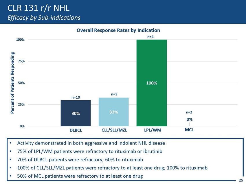 0% 5% 10% 15% 20% 25% 30% 35% 40% 45% Phase 2 Response Rates 1 ORR 4 CR 5 ORR ORR CR CR CLR 131 r/r NHL Efficacy in Heavily Pretreated Patients • Diverse, advanced and heavily pretreated patient population – Multiple r/r B - cell lymphoma histologies: DLBCL, transformed DLBCL, CLL/SLL, MZL, MCL, LPL/WM – Median 3 prior lines of systemic therapy – ~47 % of patients were refractory to prior therapy – ~53% of patients were refractory to rituximab • Differentiated safety profile Both ~50mCi & ~75mCi Doses Demonstrate Efficacy in r/r non - Hodgkin’s Lymphoma 24 ~50mCi TBD 2 (n=12) ~75mCi TBD 2 (n=7) Combined (n=19) 1. To date 2. Total Body Dose 3. 95% confidence interval (10 – 60%), (19 - 62%), (29 – 55%) respectively. 4. (Overall Respo nse Rate 5. Complete Response 42% 3 17% 11% 43% 3 42% 3 Percent of Patients