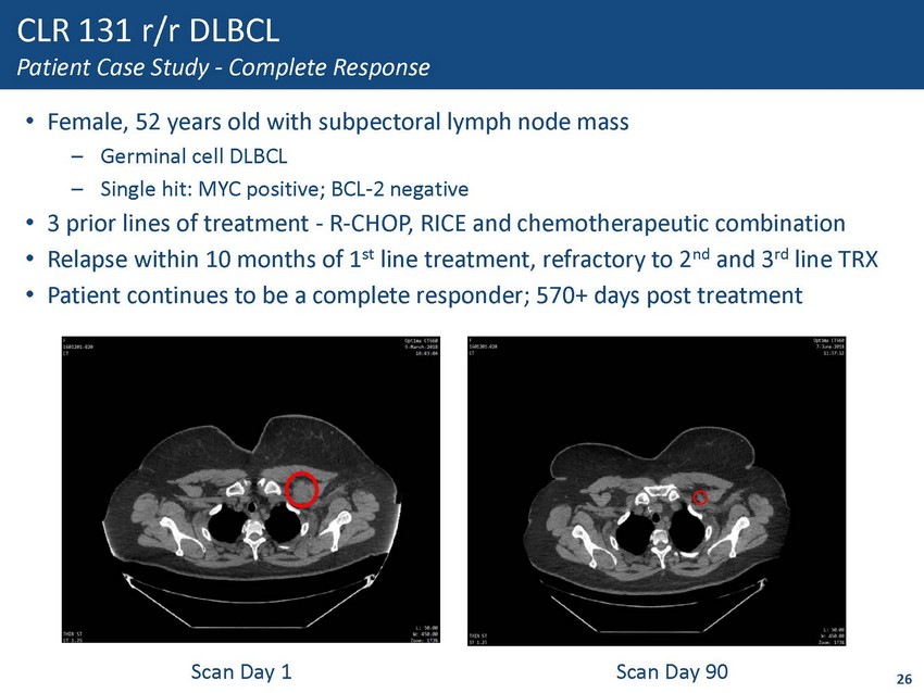CLR 131 r/r NHL Efficacy by Sub - indications 30% 33% 100% 0% 0% 25% 50% 75% 100% Percent of Patients Responding Overall Response Rates by Indication n=10 n=3 n=4 MCL • Activity demonstrated in both aggressive and indolent NHL disease • 75% of LPL/WM patients were refractory to rituximab or ibrutinib • 70% of DLBCL patients were refractory; 60% to rituximab • 100% of CLL/SLL/MZL patients were refractory to at least one drug; 100% to rituximab • 50% of MCL patients were refractory to at least one drug n=2 25 DLBCL CLL/SLL/MZL LPL/WM