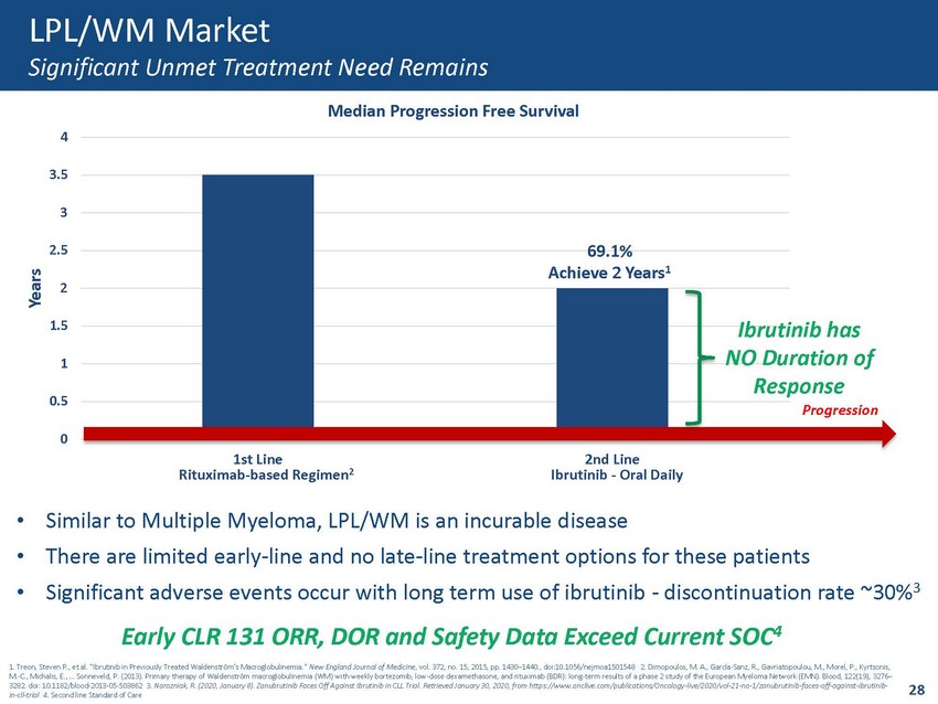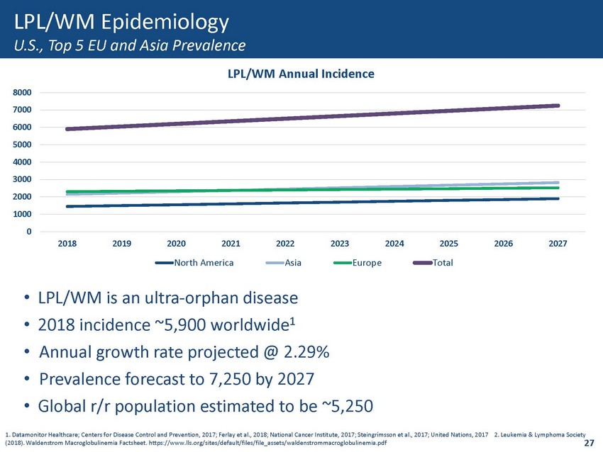 LPL/WM Epidemiology U.S., Top 5 EU and Asia Prevalence 1. Datamonitor Healthcare; Centers for Disease Control and Prevention, 2017; Ferlay et al., 2018; National Cancer Institute, 201 7; Steingrímsson et al., 2017; United Nations, 2017 2. Leukemia & Lymphoma Society (2018). Waldenstrom Macroglobulinemia Factsheet. https://www.lls.org/sites/default/files/file_assets/waldenstrommacroglobulin emi a.pdf • LPL/WM is an ultra - orphan disease • 2018 incidence ~5,900 worldwide 1 • Annual growth rate projected @ 2.29% • Prevalence forecast to 7,250 by 2027 • Global r/r population estimated to be ~5,250 0 1000 2000 3000 4000 5000 6000 7000 8000 2018 2019 2020 2021 2022 2023 2024 2025 2026 2027 LPL/WM Annual Incidence North America Asia Europe Total 27