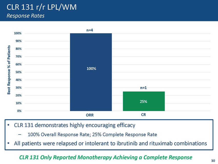 LPL/WM Market Significant Unmet Treatment Need Remains 0 0.5 1 1.5 2 2.5 3 3.5 4 1st Line 2nd Line Years Median Progression Free Survival Rituximab - based Regimen 2 Ibrutinib - Oral Daily • Similar to Multiple Myeloma, LPL/WM is an incurable disease • There are limited early - line and no late - line treatment options for these patients • Significant adverse events occur with long term use of ibrutinib - discontinuation rate ~30% 3 Early CLR 131 ORR, DOR and Safety Data Exceed Current SOC 4 Progression 1. Treon, Steven P., et al. “Ibrutinib in Previously Treated Waldenström’s Macroglobulinemia.” New England Journal of Medicine , vol. 372, no. 15, 2015, pp. 1430 – 1440., doi:10.1056/nejmoa1501548 2. Dimopoulos, M. A., García - Sanz, R., Gavriatopoulou, M., Morel, P., Kyrtsonis, M. - C., Michalis, E., … Sonneveld, P. (2013). Primary therapy of Waldenström macroglobulinemia (WM) with weekly bortezomib, low - d ose dexamethasone, and rituximab (BDR): long - term results of a phase 2 study of the European Myeloma Network (EMN). Blood, 122(1 9), 3276 – 3282. doi: 10.1182/blood - 2013 - 05 - 503862 3. Narozniak, R. (2020, January 8). Zanubrutinib Faces Off Against Ibrutinib in CLL Trial. Retrieved January 30, 2020, from http s:/ /www.onclive.com/publications/Oncology - live/2020/vol - 21 - no - 1/zanubrutinib - faces - off - against - ibrutinib - in - cll - trial 4 . Second line Standard of Care Ibrutinib has NO Duration of Response 69.1% Achieve 2 Years 1 28