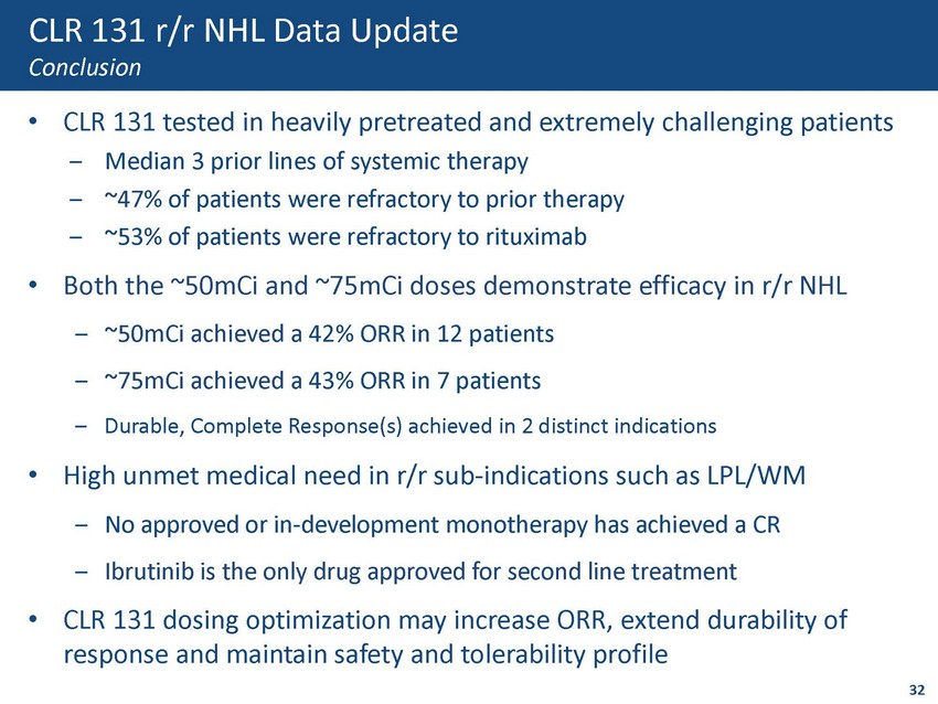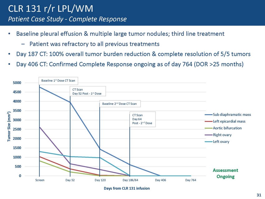 CLR 131 r/r LPL/WM Patient Case Study - Complete Response • Baseline pleural effusion & multiple large tumor nodules; third line treatment ‒ Patient was refractory to all previous treatments • Day 187 CT: 100% overall tumor burden reduction & complete resolution of 5/5 tumors • Day 406 CT: Confirmed Complete Response ongoing as of day 764 (DOR >25 months) 0 500 1000 1500 2000 2500 3000 3500 4000 4500 5000 Screen Day 52 Day 120 Day 186/64 Day 406 Day 764 Tumor Size (mm 2 ) Days from CLR 131 infusion Sub diaphramatic mass Left epicardial mass Aortic bifurcation Right ovary Left ovary Assessment Ongoing Baseline 1 st Dose CT Scan CT Scan Day 64 Post - 2 nd Dose CT Scan Day 52 Post - 1 st Dose Baseline 2 nd Dose CT Scan 31