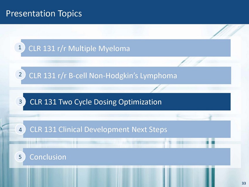 CLR 131 r/r NHL Data Update Conclusion • CLR 131 tested in heavily pretreated and extremely challenging patients ‒ Median 3 prior lines of systemic therapy ‒ ~47 % of patients were refractory to prior therapy ‒ ~53% of patients were refractory to rituximab • Both the ~50mCi and ~75mCi doses demonstrate efficacy in r/r NHL ‒ ~50mCi achieved a 42% ORR in 12 patients ‒ ~75mCi achieved a 43% ORR in 7 patients ‒ Durable, Complete Response(s) achieved in 2 distinct indications • High unmet medical need in r/r sub - indications such as LPL/WM ‒ No approved or in - development monotherapy has achieved a CR ‒ Ibrutinib is the only drug approved for second line treatment • CLR 131 dosing optimization may increase ORR, extend durability of response and maintain safety and tolerability profile 32