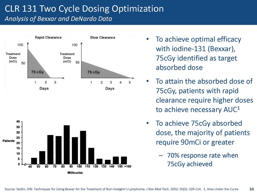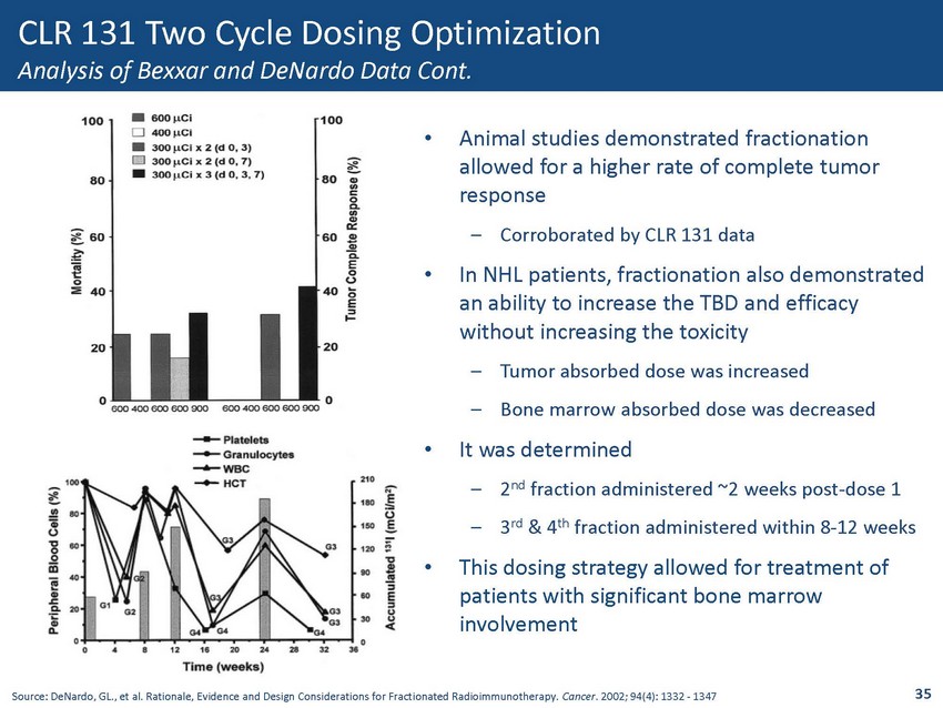 CLR 131 Two Cycle Dosing Optimization Analysis of Bexxar and DeNardo Data • To achieve optimal efficacy with iodine - 131 (Bexxar), 75cGy identified as target absorbed dose • To attain the absorbed dose of 75cGy, patients with rapid clearance require higher doses to achieve necessary AUC 1 • To achieve 75cGy absorbed dose, the majority of patients require 90mCi or greater – 70% response rate when 75cGy achieved Source: Seldin, DW. Techniques for Using Bexxar for the Treatment of Non - Hodgkin’s Lymphoma. J Nuc Med Tech . 2002; 30(3): 109 - 114. 1. Area Under the Curve 34