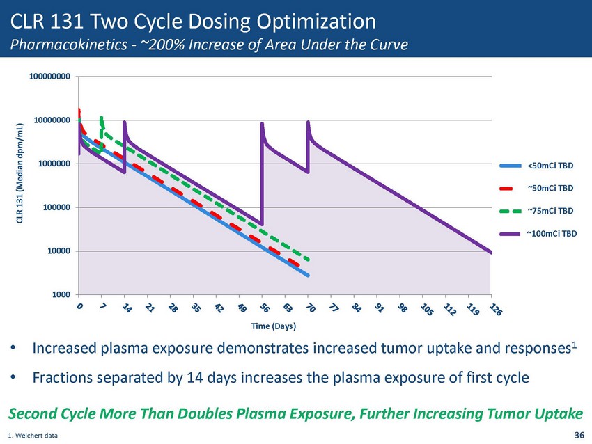 • Animal studies demonstrated fractionation allowed for a higher rate of complete tumor response – Corroborated by CLR 131 data • In NHL patients, fractionation also demonstrated an ability to increase the TBD and efficacy without increasing the toxicity – Tumor absorbed dose was increased – Bone marrow absorbed dose was decreased • It was determined – 2 nd fraction administered ~2 weeks post - dose 1 – 3 rd & 4 th fraction administered within 8 - 12 weeks • This dosing strategy allowed for treatment of patients with significant bone marrow involvement Source: DeNardo, GL., et al. Rationale, Evidence and Design Considerations for Fractionated Radioimmunotherapy. Cancer . 2002; 94(4): 1332 - 1347 35 CLR 131 Two Cycle Dosing Optimization Analysis of Bexxar and DeNardo Data Cont.