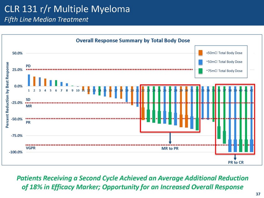 1000 10000 100000 1000000 10000000 100000000 CLR 131 (Median dpm/mL) Time (Days) <50 mCi TBD ~50 mCi TBD ~75 mCi TBD ~100 mCi TBD CLR 131 Two Cycle Dosing Optimization Pharmacokinetics - ~200% Increase of Area Under the Curve • Increased plasma exposure demonstrates increased tumor uptake and responses 1 • Fractions separated by 14 days increases the plasma exposure of first cycle 36 Second Cycle More Than Doubles Plasma Exposure, Further Increasing Tumor Uptake 1. Weichert data <50mCi TBD ~50mCi TBD ~75mCi TBD ~100mCi TBD