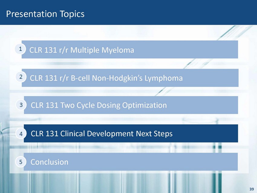 39 CLR 131 r/r Multiple Myeloma 1 Presentation Topics CLR 131 r/r B - cell Non - Hodgkin’s Lymphoma 2 CLR 131 Two Cycle Dosing Optimization 3 CLR 131 Clinical Development Next Steps 4 Conclusion 5