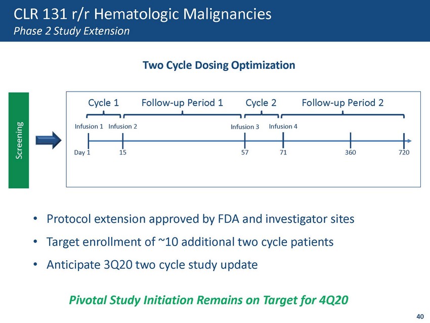 Two Cycle Dosing Optimization Screening 40 CLR 131 r/r Hematologic Malignancies Phase 2 Study Extension Day 1 Infusion 1 15 Infusion 2 57 71 Infusion 3 Infusion 4 Cycle 1 Cycle 2 720 360 Follow - up Period 1 Follow - up Period 2 • Protocol extension approved by FDA and investigator sites • Target enrollment of ~10 additional two cycle patients • Anticipate 3Q20 two cycle study update Pivotal Study Initiation Remains on Target for 4Q20
