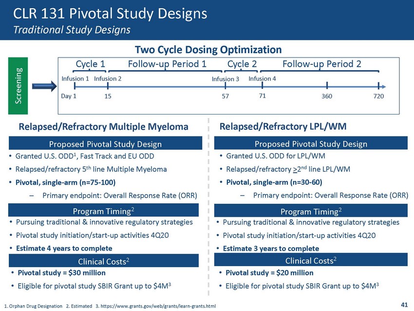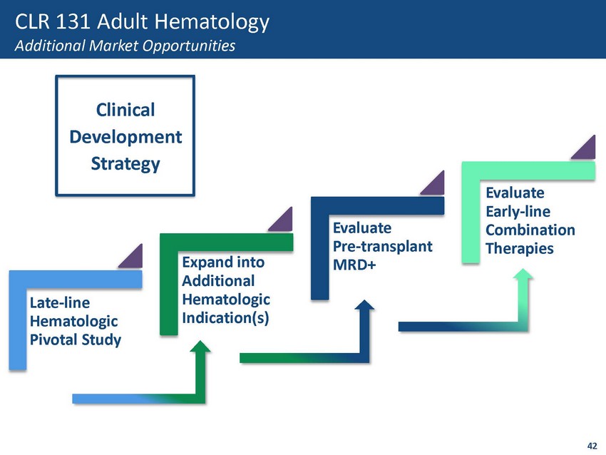 Proposed Pivotal Study Design Program Timing 2 Clinical Costs 2 • Granted U.S. ODD 1 , Fast Track and EU ODD • Relapsed/refractory 5 th line Multiple Myeloma • Pivotal, single - arm (n=75 - 100) – Primary endpoint: Overall Response Rate (ORR) • Pursuing traditional & innovative regulatory strategies • Pivotal study initiation/start - up activities 4Q20 • Estimate 4 years to complete • Pivotal study = $30 million • Eligible for pivotal study SBIR Grant up to $4M 3 Screening 1. Orphan Drug Designation 2. Estimated 3. https://www.grants.gov/web/grants/learn - grants.html 41 CLR 131 Pivotal Study Designs Traditional Study Designs Day 1 Infusion 1 15 Infusion 2 57 71 Infusion 3 Infusion 4 Cycle 1 Cycle 2 720 360 Follow - up Period 1 Follow - up Period 2 Two Cycle Dosing Optimization Proposed Pivotal Study Design • Granted U.S. ODD for LPL/WM • Relapsed/refractory > 2 nd line LPL/WM • Pivotal, single - arm (n=30 - 60) – Primary endpoint: Overall Response Rate (ORR) • Pursuing traditional & innovative regulatory strategies • Pivotal study initiation/start - up activities 4Q20 • Estimate 3 years to complete Program Timing 2 Clinical Costs 2 • Pivotal study = $20 million • Eligible for pivotal study SBIR Grant up to $4M 3 Relapsed/Refractory Multiple Myeloma Relapsed/Refractory LPL/WM