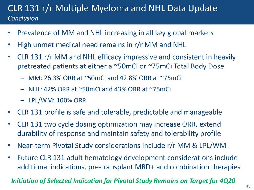 Late - line Hematologic Pivotal Study Expand into Additional Hematologic Indication(s) Evaluate Pre - transplant MRD+ Evaluate Early - line Combination Therapies CLR 131 Adult Hematology Additional Market Opportunities 42 C linical Development Strategy