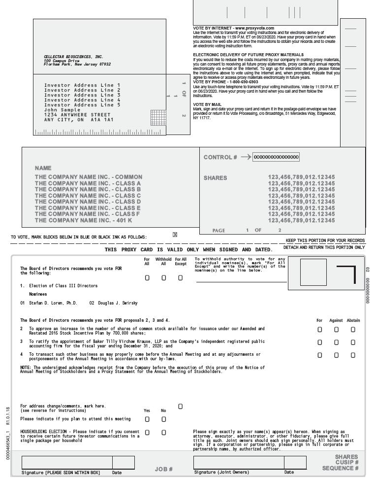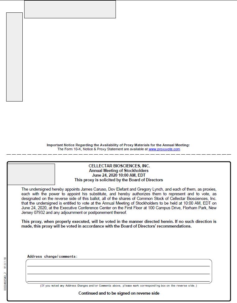 1 1 12345678 12345678 12345678 12345678 12345678 12345678 12345678 12345678 NAME THE COMPANY NAME INC. - COMMON 123,456,789,012.12345 THE COMPANY NAME INC. - CLASS A 123,456,789,012.12345 THE COMPANY NAME INC. - CLASS B 123,456,789,012.12345 THE COMPANY NAME INC. - CLASS C 123,456,789,012.12345 THE COMPANY NAME INC. - CLASS D 123,456,789,012.12345 THE COMPANY NAME INC. - CLASS E 123,456,789,012.12345 THE COMPANY NAME INC. - CLASS F 123,456,789,012.12345 THE COMPANY NAME INC. - 401 K 123,456,789,012.12345 → x 02 0000000000 JOB # 1 OF 2 1 OF 2 PAGE SHARES CUSIP # SEQUENCE # THIS PROXY CARD IS VALID ONLY WHEN SIGNED AND DATED. KEEP THIS PORTION FOR YOUR RECORDS DETACH AND RETURN THIS PORTION ONLY TO VOTE, MARK BLOCKS BELOW IN BLUE OR BLACK INK AS FOLLOWS: Signature [PLEASE SIGN WITHIN BOX] Date Signature (Joint Owners) Date CONTROL # SHARES To withhold authority to vote for any individual nominee(s), mark “For All Except” and write the number(s) of the nominee(s) on the line below. 0 0 0 0 0 0 0 0 0 0 0 0 0 0 0 0 0 0000466543_1 R1.0.1.18 For Withhold For All All All Except The Board of Directors recommends you vote FOR the following: 1. Election of Class III Directors Nominees 01 Stefan D. Loren, Ph.D. 02 Douglas J. Swirsky CELLECTAR BIOSCIENCES, INC. 100 Campus Drive Florham Park, New Jersey 07932 Investor Address Line 1 Investor Address Line 2 Investor Address Line 3 Investor Address Line 4 Investor Address Line 5 John Sample 1234 ANYWHERE STREET ANY CITY, ON A1A 1A1 VOTE BY INTERNET - www.proxyvote.com Use the Internet to transmit your voting instructions and for electronic delivery of information. Vote by 11:59 P.M. ET on 06/23/2020. Have your proxy card in hand when you access the web site and follow the instructions to obtain your records and to create an electronic voting instruction form. ELECTRONIC DELIVERY OF FUTURE PROXY MATERIALS If you would like to reduce the costs incurred by our company in mailing proxy materials, you can consent to receiving all future proxy statements, proxy cards and annual reports electronically via e-mail or the Internet. To sign up for electronic delivery, please follow the instructions above to vote using the Internet and, when prompted, indicate that you agree to receive or access proxy materials electronically in future years. VOTE BY PHONE - 1-800-690-6903 Use any touch-tone telephone to transmit your voting instructions. Vote by 11:59 P.M. ET on 06/23/2020. Have your proxy card in hand when you call and then follow the instructions. VOTE BY MAIL Mark, sign and date your proxy card and return it in the postage-paid envelope we have provided or return it to Vote Processing, c/o Broadridge, 51 Mercedes Way, Edgewood, NY 11717. The Board of Directors recommends you vote FOR proposals 2, 3 and 4. For Against Abstain 2 To approve an increase in the number of shares of common stock available for issuance under our Amended and Restated 2015 Stock Incentive Plan by 700,000 shares; 3 To ratify the appointment of Baker Tilly Virchow Krause, LLP as the Company's independent registered public accounting firm for the fiscal year ending December 31, 2020; and 4 To transact such other business as may properly come before the Annual Meeting and at any adjournments or postponements of the Annual Meeting in accordance with our by-laws. NOTE: The undersigned acknowledges receipt from the Company before the execution of this proxy of the Notice of Annual Meeting of Stockholders and a Proxy Statement for the Annual Meeting of Stockholders. Please sign exactly as your name(s) appear(s) hereon. When signing as attorney, executor, administrator, or other fiduciary, please give full title as such. Joint owners should each sign personally. All holders must sign. If a corporation or partnership, please sign in full corporate or partnership name, by authorized officer. For address change/comments, mark here. (see reverse for instructions) Yes No Please indicate if you plan to attend this meeting HOUSEHOLDING ELECTION - Please indicate if you consent to receive certain future investor communications in a single package per household