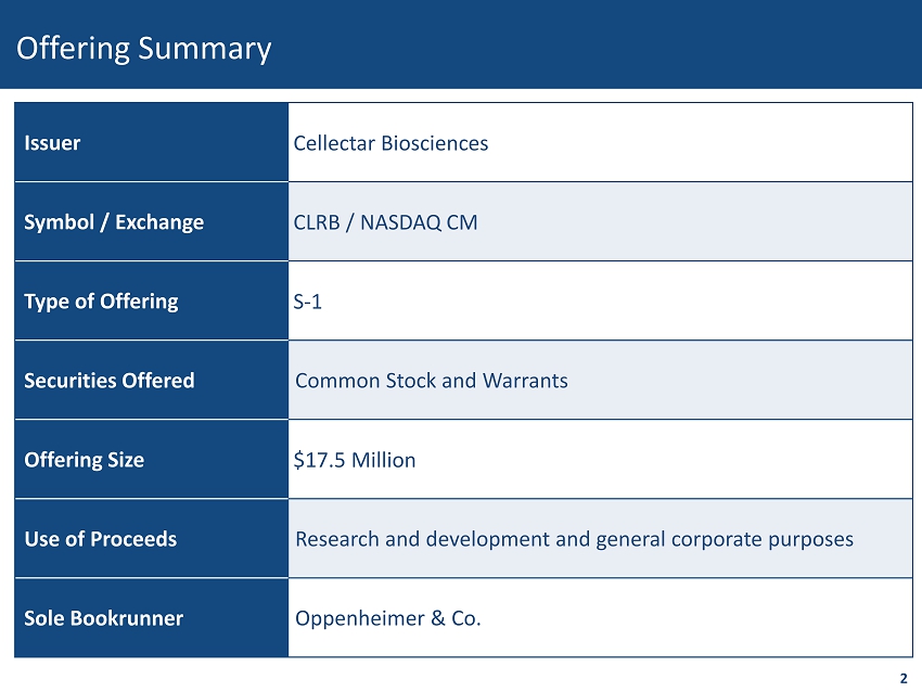 Issuer Cellectar Biosciences Symbol / Exchange CLRB / NASDAQ CM Type of Offering S - 1 Securities Offered Common Stock and Warrants Offering Size $17.5 Million Use of Proceeds Research and development and general corporate purposes Sole Bookrunner Oppenheimer & Co. 2 Offering Summary
