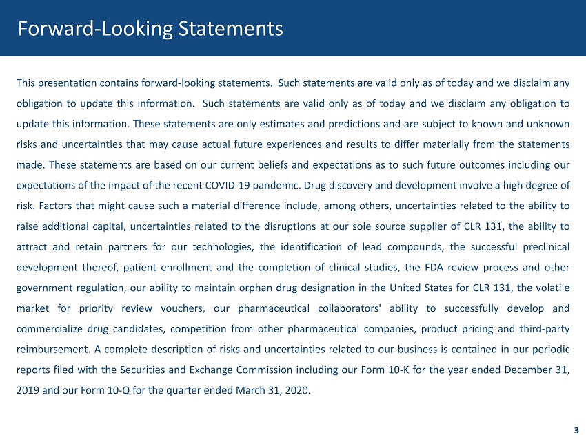 Forward - Looking Statements 3 This presentation contains forward - looking statements . Such statements are valid only as of today and we disclaim any obligation to update this information . Such statements are valid only as of today and we disclaim any obligation to update this information . These statements are only estimates and predictions and are subject to known and unknown risks and uncertainties that may cause actual future experiences and results to differ materially from the statements made . These statements are based on our current beliefs and expectations as to such future outcomes including our expectations of the impact of the recent COVID - 19 pandemic . Drug discovery and development involve a high degree of risk . Factors that might cause such a material difference include, among others, uncertainties related to the ability to raise additional capital, uncertainties related to the disruptions at our sole source supplier of CLR 131 , the ability to attract and retain partners for our technologies, the identification of lead compounds, the successful preclinical development thereof, patient enrollment and the completion of clinical studies, the FDA review process and other government regulation, our ability to maintain orphan drug designation in the United States for CLR 131 , the volatile market for priority review vouchers, our pharmaceutical collaborators' ability to successfully develop and commercialize drug candidates, competition from other pharmaceutical companies, product pricing and third - party reimbursement . A complete description of risks and uncertainties related to our business is contained in our periodic reports filed with the Securities and Exchange Commission including our Form 10 - K for the year ended December 31 , 2019 and our Form 10 - Q for the quarter ended March 31 , 2020 .