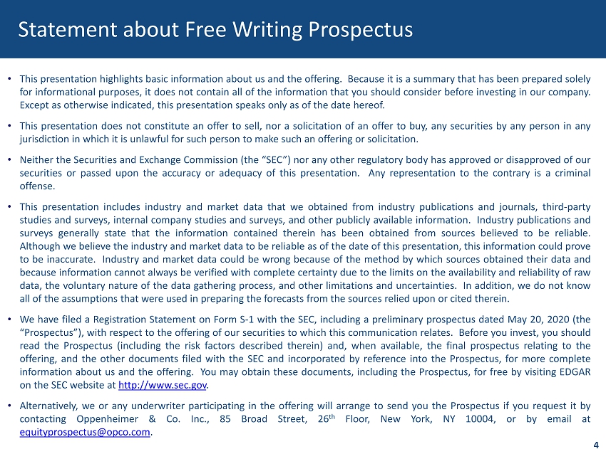 Statement about Free Writing Prospectus 4 • This presentation highlights basic information about us and the offering . Because it is a summary that has been prepared solely for informational purposes, it does not contain all of the information that you should consider before investing in our company . Except as otherwise indicated, this presentation speaks only as of the date hereof . • This presentation does not constitute an offer to sell, nor a solicitation of an offer to buy, any securities by any person in any jurisdiction in which it is unlawful for such person to make such an offering or solicitation . • Neither the Securities and Exchange Commission (the “SEC”) nor any other regulatory body has approved or disapproved of our securities or passed upon the accuracy or adequacy of this presentation . Any representation to the contrary is a criminal offense . • This presentation includes industry and market data that we obtained from industry publications and journals, third - party studies and surveys, internal company studies and surveys, and other publicly available information . Industry publications and surveys generally state that the information contained therein has been obtained from sources believed to be reliable . Although we believe the industry and market data to be reliable as of the date of this presentation, this information could prove to be inaccurate . Industry and market data could be wrong because of the method by which sources obtained their data and because information cannot always be verified with complete certainty due to the limits on the availability and reliability of raw data, the voluntary nature of the data gathering process, and other limitations and uncertainties . In addition, we do not know all of the assumptions that were used in preparing the forecasts from the sources relied upon or cited therein . • We have filed a Registration Statement on Form S - 1 with the SEC, including a preliminary prospectus dated May 20 , 2020 (the “Prospectus”), with respect to the offering of our securities to which this communication relates . Before you invest, you should read the Prospectus (including the risk factors described therein) and, when available, the final prospectus relating to the offering, and the other documents filed with the SEC and incorporated by reference into the Prospectus, for more complete information about us and the offering . You may obtain these documents, including the Prospectus, for free by visiting EDGAR on the SEC website at http : //www . sec . gov . • Alternatively, we or any underwriter participating in the offering will arrange to send you the Prospectus if you request it by contacting Oppenheimer & Co . Inc . , 85 Broad Street, 26 th Floor, New York, NY 10004 , or by email at equityprospectus@opco . com .