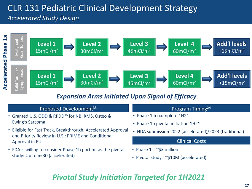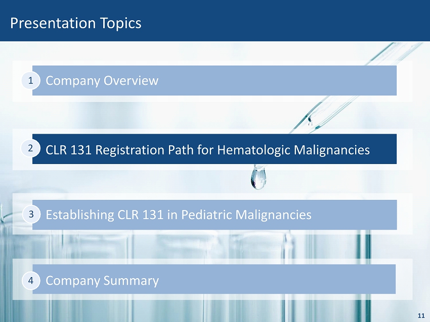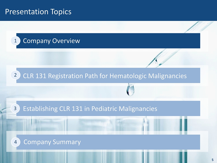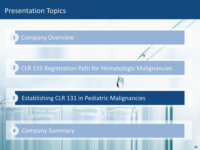 Company Summary Company Overview 1 26 CLR 131 Registration Path for Hematologic Malignancies 2 Presentation Topics Establishing CLR 131 in Pediatric Malignancies 3 4