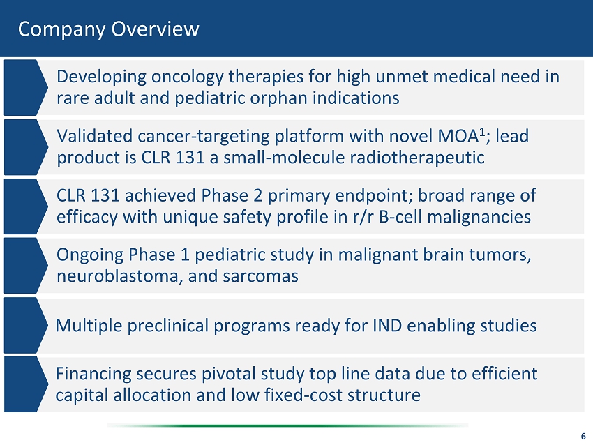 Company Summary Company Overview 1 5 CLR 131 Registration Path for Hematologic Malignancies 2 Presentation Topics Establishing CLR 131 in Pediatric Malignancies 3 4