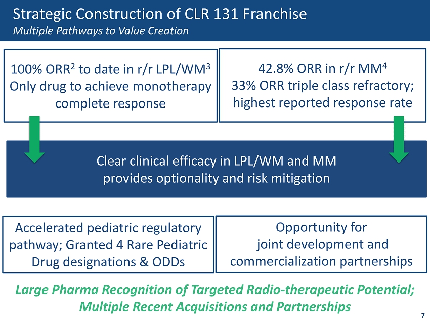 Financing secures pivotal study top line data due to efficient capital allocation and low fixed - cost structure Developing oncology therapies for high unmet medical need in rare adult and pediatric orphan indications 6 Multiple preclinical programs ready for IND enabling studies Ongoing Phase 1 pediatric study in malignant brain tumors, neuroblastoma, and sarcomas Company Overview CLR 131 achieved Phase 2 primary endpoint; broad range of efficacy with unique safety profile in r/r B - cell malignancies Validated cancer - targeting platform with novel MOA 1 ; lead product is CLR 131 a small - molecule radiotherapeutic