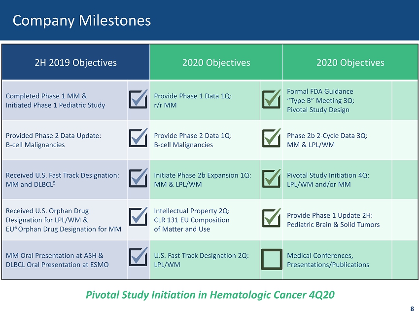 Strategic Construction of CLR 131 Franchise Multiple Pathways to Value Creation Large Pharma Recognition of Targeted Radio - therapeutic Potential; Multiple Recent Acquisitions and Partnerships 100% ORR 2 to date in r/r LPL/WM 3 Only drug to achieve monotherapy complete response 42.8% ORR in r/r MM 4 33% ORR triple class refractory; highest reported response rate Accelerated pediatric regulatory pathway; Granted 4 Rare Pediatric Drug designations & ODDs Opportunity for joint development and commercialization partnerships 7 Clear clinical efficacy in LPL/WM and MM provides optionality and risk mitigation