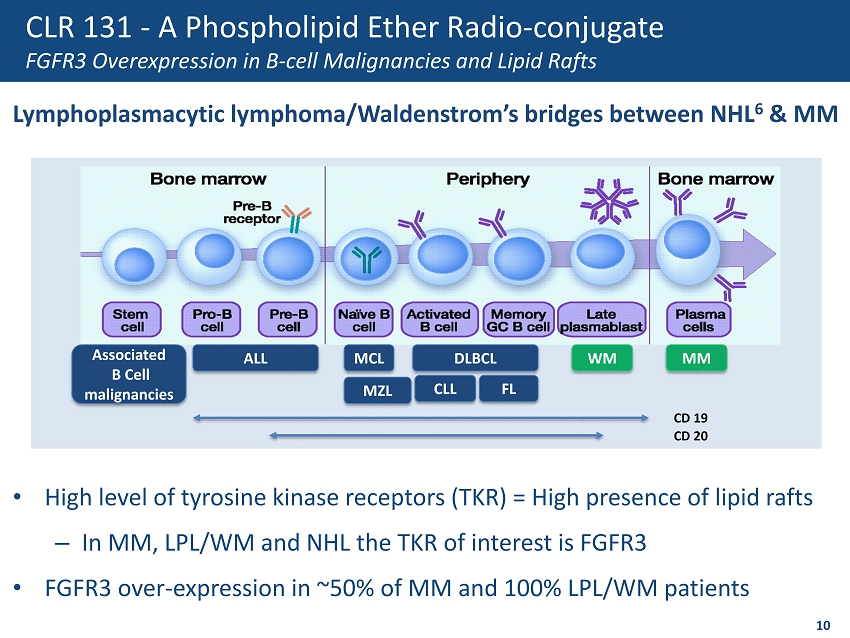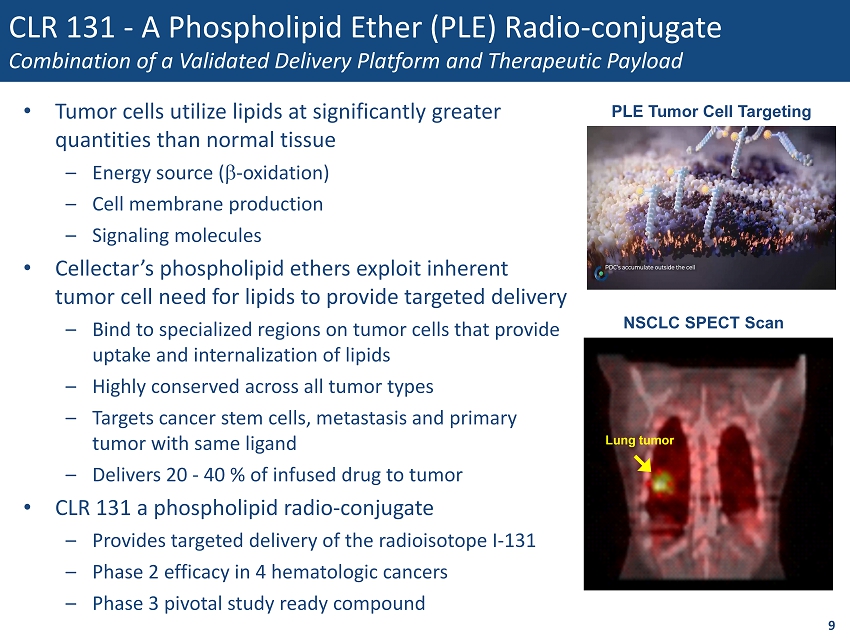 CLR 131 - A Phospholipid Ether (PLE) Radio - conjugate Combination of a Validated Delivery Platform and Therapeutic Payload • Tumor cells utilize lipids at significantly greater quantities than normal tissue – Energy source ( b - oxidation) – Cell membrane production – Signaling molecules • Cellectar’s phospholipid ethers exploit inherent tumor cell need for lipids to provide targeted delivery – Bind to specialized regions on tumor cells that provide uptake and internalization of lipids – Highly conserved across all tumor types – Targets cancer stem cells, metastasis and primary tumor with same ligand – Delivers 20 - 40 % of infused drug to tumor • CLR 131 a phospholipid radio - conjugate – Provides targeted delivery of the radioisotope I - 131 – Phase 2 efficacy in 4 hematologic cancers – Phase 3 pivotal study ready compound 9 PLE Tumor Cell Targeting Lung tumor NSCLC SPECT Scan