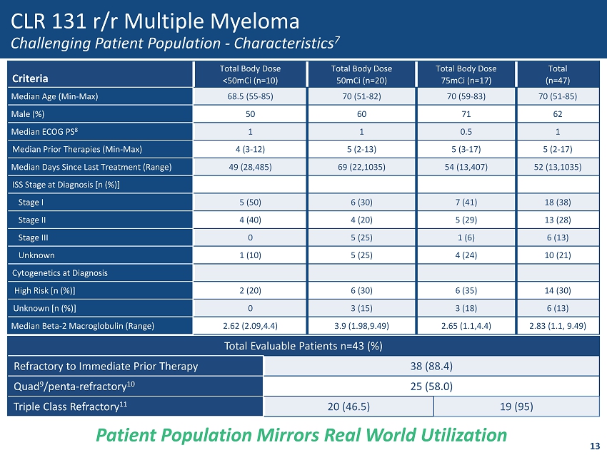 • <50mCi Total Body Dose Single Dose • 50mCi Total Body Dose Single Cycle • 75mCi Total Body Dose Single Cycle CLR 131 Phase 2 Study Design Phase 2b Initiated; Heading to Pivotal 12 CLL/SLL, MZL, LPL/WM DLBCL MM Potential Expansion to Pivotal Futility Efficacy Assessments Interim efficacy assessment by cohort, expansion into select cohorts MM MCL LPL/WM • 100mCi Total Body Dose Two Cycle − Cycle 1 dosed day 1 and 15 − Cycle 2 dosed day 57 and 71 Part A Study Dosing Adaptive Design to Confirm Benefits of 100mCi Total Body Dose (TBD) Part A Completed Part B Enrolling Part B Study Dosing