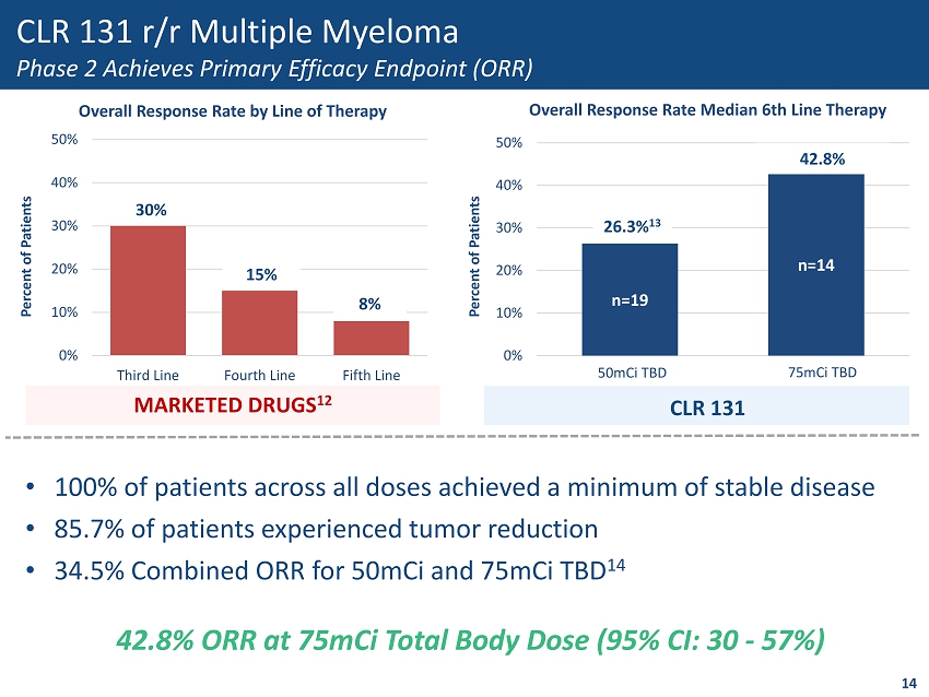 Criteria Total Body Dose <50mCi ( n=10) Total Body Dose 50mCi ( n=20) Total Body Dose 75mCi (n=17) Total (n=47) Median Age (Min - Max) 68.5 (55 - 85) 70 (51 - 82) 70 (59 - 83) 70 (51 - 85) Male (%) 50 60 71 62 Median ECOG PS 8 1 1 0.5 1 Median Prior Therapies (Min - Max) 4 (3 - 12) 5 (2 - 13) 5 (3 - 17) 5 (2 - 17) Median Days Since Last Treatment (Range) 49 (28,485) 69 (22,1035) 54 (13,407) 52 (13,1035) ISS Stage at Diagnosis [n (%)] Stage I 5 (50) 6 (30) 7 (41) 18 (38) Stage II 4 (40) 4 (20) 5 (29) 13 (28) Stage III 0 5 (25) 1 (6) 6 (13) Unknown 1 (10) 5 (25) 4 (24) 10 (21) Cytogenetics at Diagnosis High Risk [n (%)] 2 (20) 6 (30) 6 (35) 14 (30) Unknown [n (%)] 0 3 (15) 3 (18) 6 (13) Median Beta - 2 Macroglobulin (Range) 2.62 (2.09,4.4) 3.9 (1.98,9.49) 2.65 (1.1,4.4) 2.83 (1.1, 9.49) 13 CLR 131 r/r Multiple Myeloma Challenging Patient Population - Characteristics 7 Patient Population Mirrors Real World Utilization Total Evaluable Patients n=43 (%) Refractory to Immediate Prior Therapy 38 (88.4) Quad 9 /penta - refractory 10 25 (58.0) Triple Class Refractory 11 20 (46.5) 19 (95)