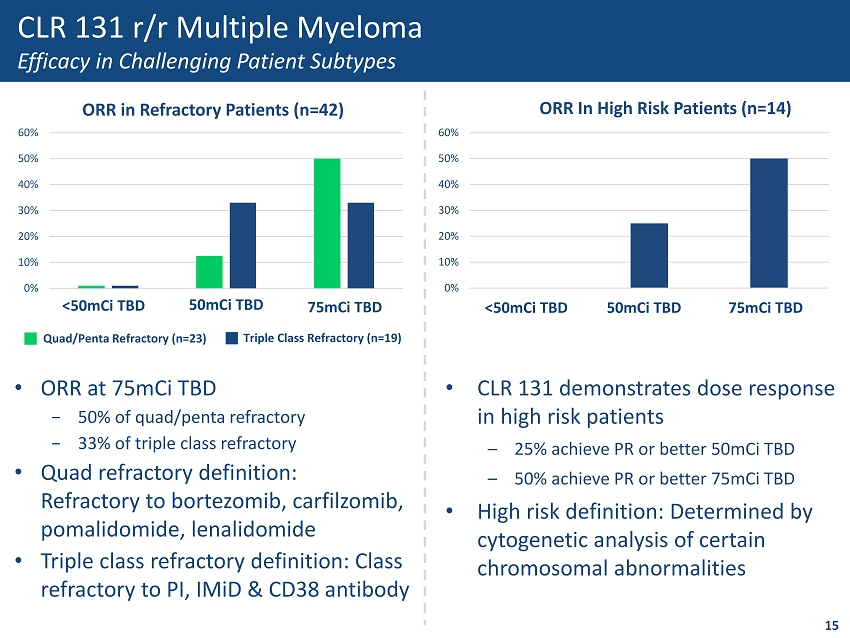 • 100% of patients across all doses achieved a minimum of stable disease • 85.7% of patients experienced tumor reduction • 34.5% Combined ORR for 50mCi and 75mCi TBD 14 n=19 n=14 0% 10% 20% 30% 40% 50% 0% 10% 20% 30% 40% 50% Third Line Fourth Line Fifth Line 8% CLR 131 r/r Multiple Myeloma Phase 2 Achieves Primary Efficacy Endpoint (ORR) 14 Percent of Patients 50mCi TBD 75mCi TBD 42.8% 26.3% 13 Percent of Patients Overall Response Rate by Line of Therapy 30% 15% 42.8% ORR at 75mCi Total Body Dose (95% CI: 30 - 57%) Overall Response Rate Median 6th Line Therapy MARKETED DRUGS 12 CLR 131
