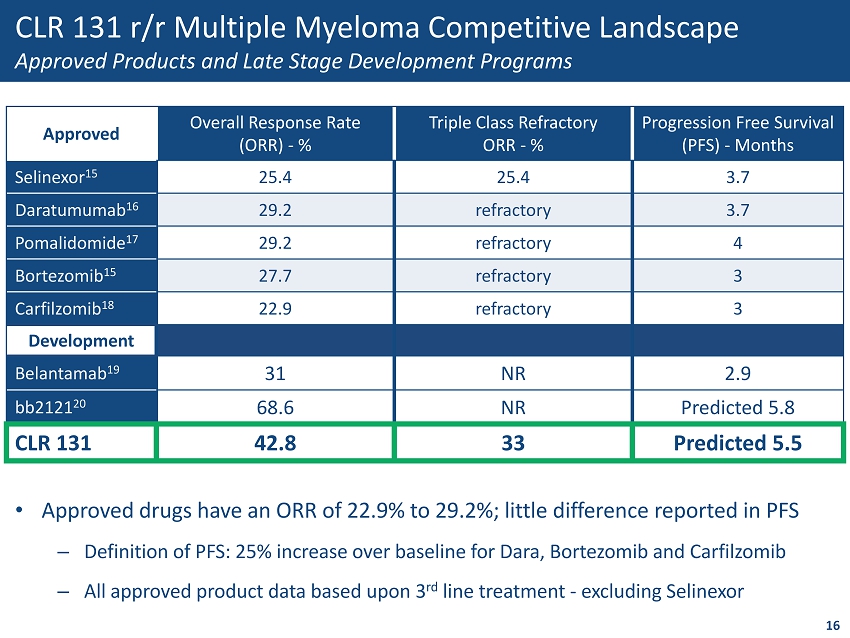 0% 10% 20% 30% 40% 50% 60% <50 mCiTBD ~50 mCi TBD ~75 mCi TBD ORR In High Risk Patients (n=14) <50mCi TBD 50mCi TBD 75mCi TBD CLR 131 r/r Multiple Myeloma Efficacy in Challenging Patient Subtypes • CLR 131 demonstrates dose response in high risk patients – 25% achieve PR or better 50mCi TBD – 50% achieve PR or better 75mCi TBD • High risk definition: Determined by cytogenetic analysis of certain chromosomal abnormalities 15 0% 10% 20% 30% 40% 50% 60% ORR in Refractory Patients (n=42) <50mCi TBD ~50mCi TBD 75mCi TBD 50mCi TBD <50mCi TBD • ORR at 75mCi TBD − 50% of quad/ penta refractory − 33% of triple class refractory • Quad refractory definition: Refractory to bortezomib, carfilzomib, pomalidomide, lenalidomide • Triple class refractory definition: Class refractory to PI, IMiD & CD38 antibody Quad/Penta Refractory (n=23) Triple Class Refractory (n=19)