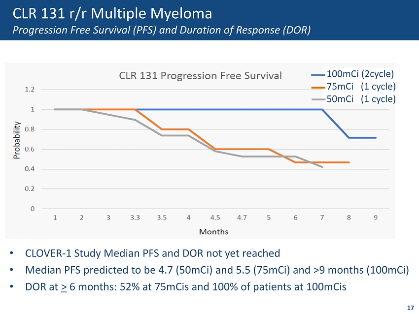 CLR 131 r/r Multiple Myeloma Competitive Landscape Approved Products and Late Stage Development Programs Approved Overall Response Rate (ORR) - % Triple Class Refractory ORR - % Progression Free Survival (PFS) - Months Selinexor 15 25.4 25.4 3.7 Daratumumab 16 29.2 refractory 3.7 Pomalidomide 17 29.2 refractory 4 Bortezomib 15 27.7 refractory 3 Carfilzomib 18 22.9 refractory 3 Development Belantamab 19 31 NR 2.9 bb2121 20 68.6 NR Predicted 5.8 CLR 131 42.8 33 Predicted 5.5 • Approved drugs have an ORR of 22.9% to 29.2%; little difference reported in PFS ‒ Definition of PFS: 25% increase over baseline for Dara, Bortezomib and Carfilzomib ‒ All approved product data based upon 3 rd line treatment - excluding Selinexor 16
