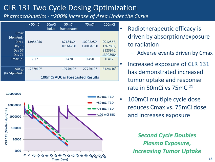CLR 131 r/r Multiple Myeloma Progression Free Survival (PFS) and Duration of Response (DOR) • CLOVER - 1 Study Median PFS and DOR not yet reached • Median PFS predicted to be 4.7 (50mCi) and 5.5 (75mCi) and >9 months (100mCi) • DOR at > 6 months: 52% at 75mCis and 100% of patients at 100mCis 17 100mCi (2cycle) 75mCi (1 cycle) 50mCi (1 cycle)