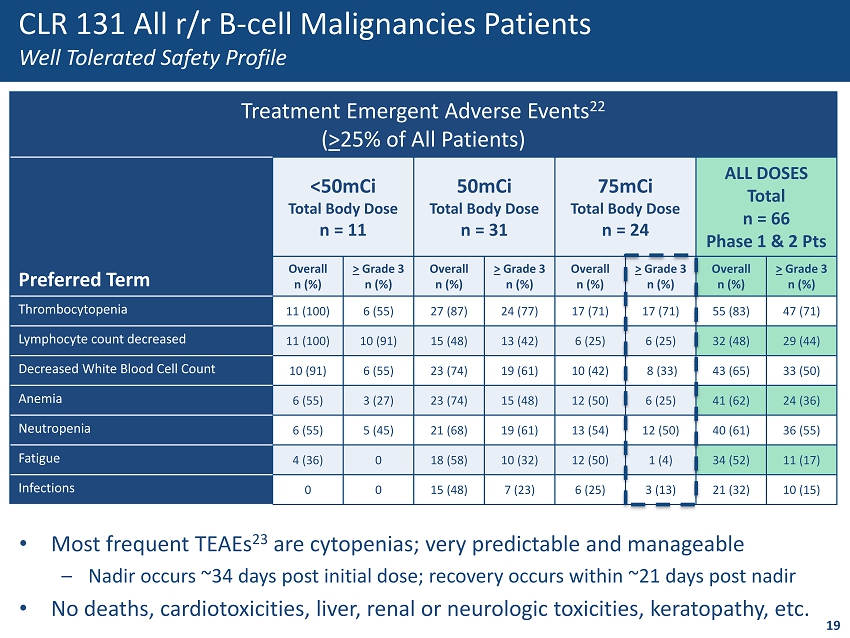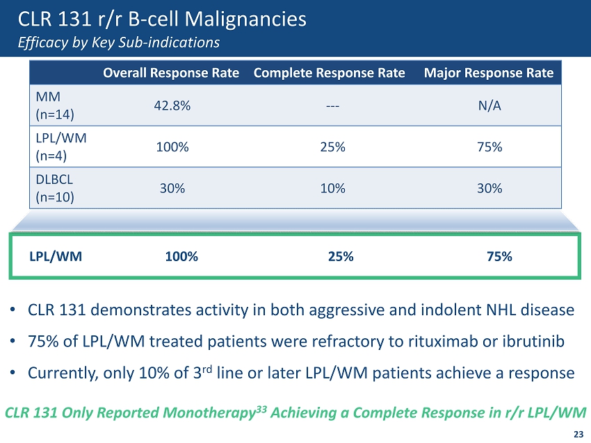 CLR 131 All r/r B - cell Malignancies Patients Well Tolerated Safety Profile Treatment Emergent Adverse Events 22 ( > 25% of All Patients) Preferred Term <50mCi Total Body Dose n = 11 50mCi Total Body Dose n = 31 75mCi Total Body Dose n = 24 ALL DOSES Total n = 66 Phase 1 & 2 Pts Overall n (%) > Grade 3 n (%) Overall n (%) > Grade 3 n (%) Overall n (%) > Grade 3 n (%) Overall n (%) > Grade 3 n (%) Thrombocytopenia 11 (100) 6 (55) 27 (87) 24 (77) 17 (71) 17 (71) 55 (83) 47 (71) Lymphocyte count decreased 11 (100) 10 (91) 15 (48) 13 (42) 6 (25) 6 (25) 32 (48) 29 (44) Decreased White Blood Cell Count 10 (91) 6 (55) 23 (74) 19 (61) 10 (42) 8 (33) 43 (65) 33 (50) Anemia 6 (55) 3 (27) 23 (74) 15 (48) 12 (50) 6 (25) 41 (62) 24 (36) Neutropenia 6 (55) 5 (45) 21 (68) 19 (61) 13 (54) 12 (50) 40 (61) 36 (55) Fatigue 4 (36) 0 18 (58) 10 (32) 12 (50) 1 (4) 34 (52) 11 (17) Infections 0 0 15 (48) 7 (23) 6 (25) 3 (13) 21 (32) 10 (15) 19 • Most frequent TEAEs 23 are cytopenias; very predictable and manageable – Nadir occurs ~34 days post initial dose; recovery occurs within ~21 days post nadir • No deaths, cardiotoxicities, liver, renal or neurologic toxicities, keratopathy, etc.