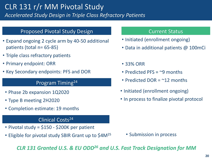 Proposed Pivotal Study Design Program Timing 24 Clinical Costs 24 • Expand ongoing 2 cycle arm by 40 - 50 additional patients (total n= 65 - 85) • Triple class refractory patients • Primary endpoint: ORR • Key Secondary endpoints: PFS and DOR • Phase 2b expansion 1Q2020 • Type B meeting 2H2020 • Completion estimate: 19 months • Pivotal study = $150 - $200K per patient • Eligible for pivotal study SBIR Grant up to $4M 25 20 CLR 131 r/r MM Pivotal Study Accelerated Study Design in Triple Class Refractory Patients Current Status • Initiated (enrollment ongoing) • Data in additional patients @ 100mCi • 33% ORR • Predicted PFS = ~9 months • Predicted DOR = ~12 months • Initiated (enrollment ongoing) • In process to finalize pivotal protocol CLR 131 Granted U.S. & EU ODD 26 and U.S. Fast Track Designation for MM • Submission in process