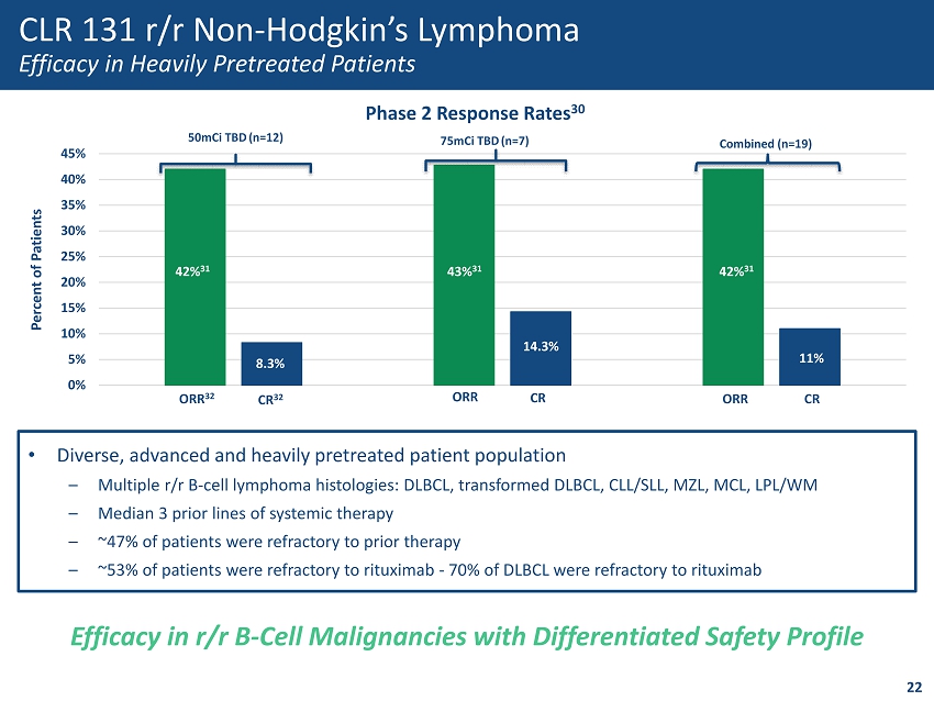 1000 10000 100000 1000000 10000000 100000000 CLR 131 (Median dpm/mL) Time (Days) <50 mCi TBD ~50 mCi TBD ~75 mCi TBD ~100 mCi TBD CLR 131 Two Cycle Dosing Optimization Pharmacokinetics - ~200% Increase of Area Under the Curve • Radiotherapeutic efficacy is driven by absorption/exposure to radiation – Adverse events driven by Cmax • Increased exposure of CLR 131 has demonstrated increased tumor uptake and response rate in 50mCi vs 75mCi 21 • 100mCi multiple cycle dose reduces Cmax vs. 75mCi dose and increases exposure 18 Second Cycle Doubles Plasma Exposure, Increasing Tumor Uptake <50mCi 50mCi bolus 50mCi fractionated 75mCi 100mCi Cmax ( dpm /mL) Day 1 Day 15 Day 57 Day 71 13956050 8718430, 10164250 10202250, 120034350 9012567, 1367832, 9123976, 13908984 Tmax (h) 2.17 0.420 0.450 0.412 AUC inf (hr* dpm /mL) 1257x10 6 1974x10 6 2775x10 6 6124x10 6 100mCi AUC is Forecasted Results